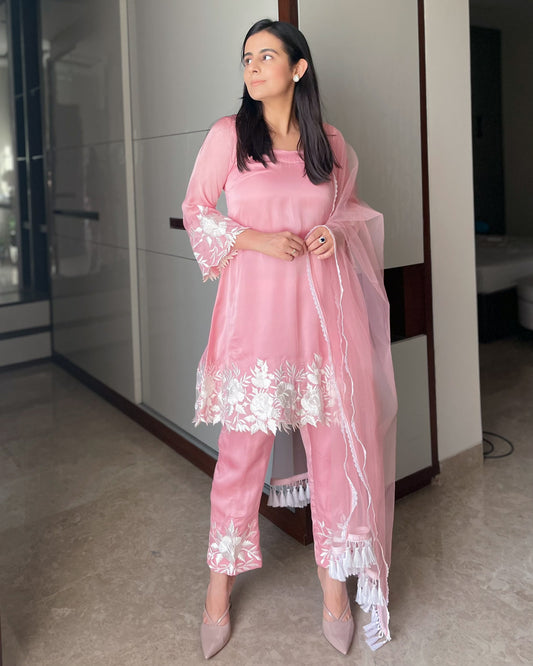 Blush Pink Satin Organza Suit with Thread Embroidery