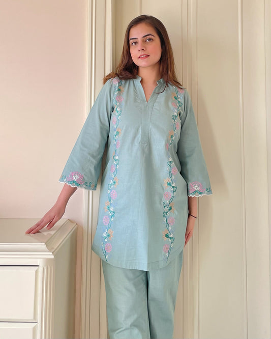 Sage Bloom Embroidered Cotton Linen Co-ord Set
