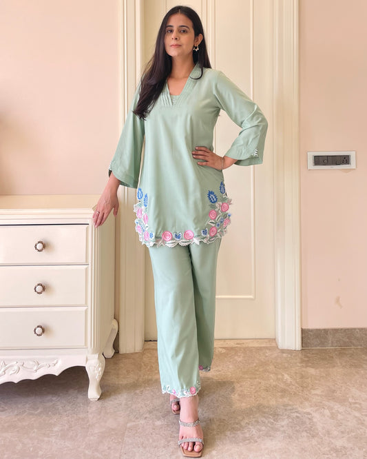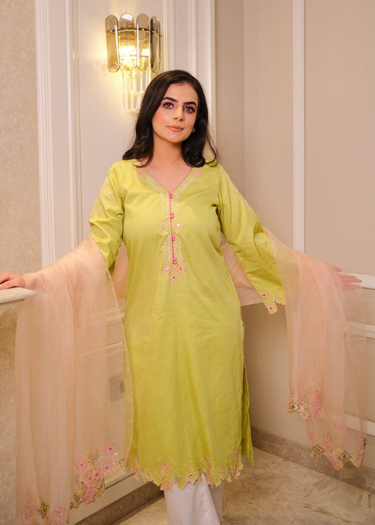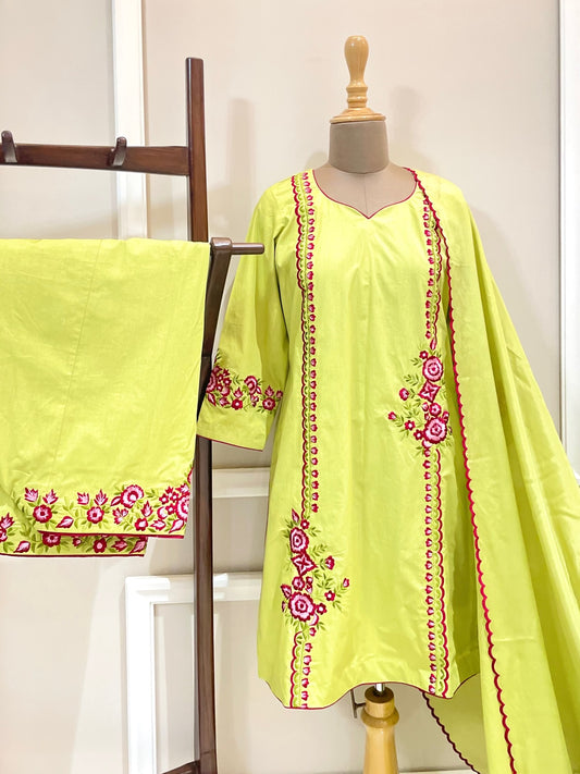 Lime Green Cotton Suit with Multi-Color Thread Embroidery