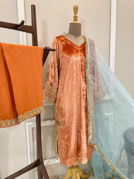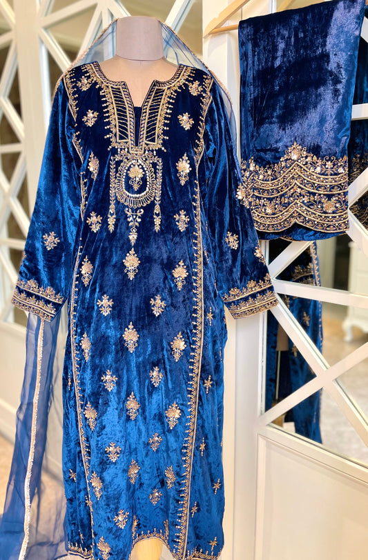 Blue Velvet Jacket Set- Handcrafted Elegance