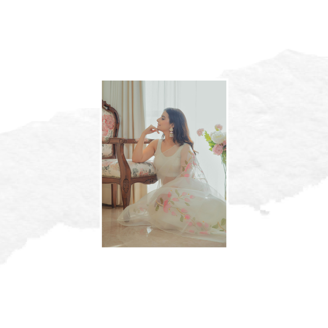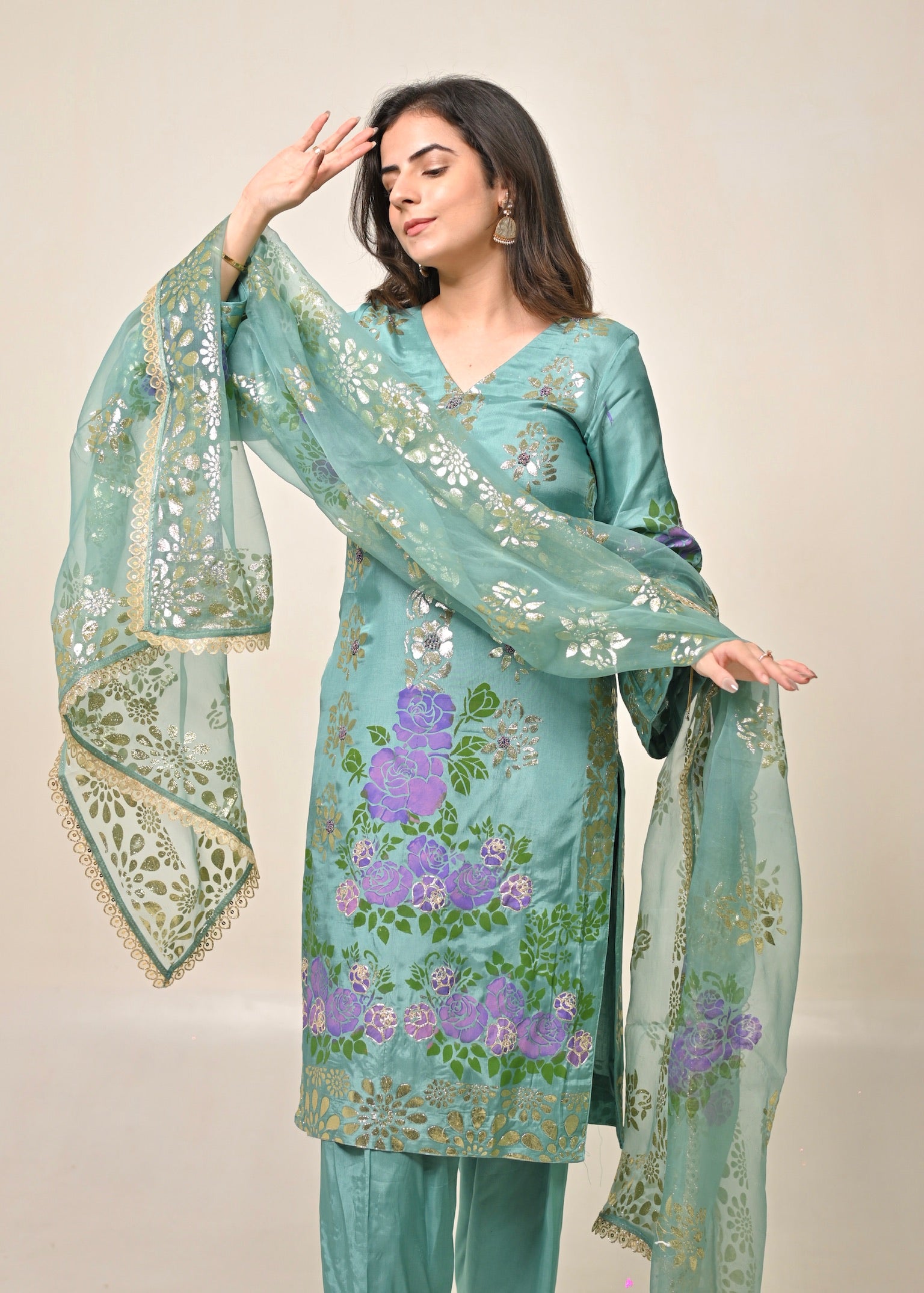 • Suit: Pure organza with block print and hand-painted detailing