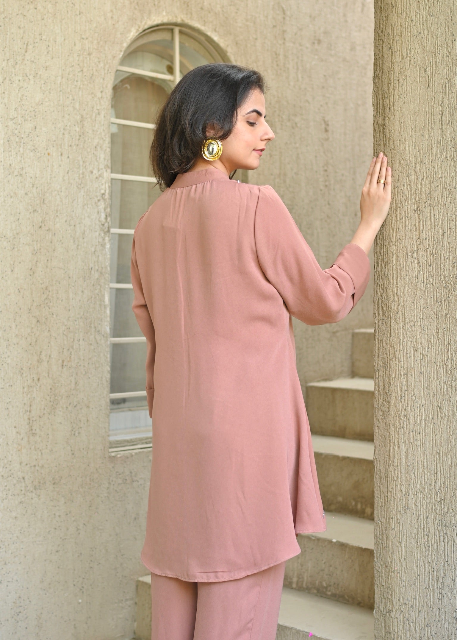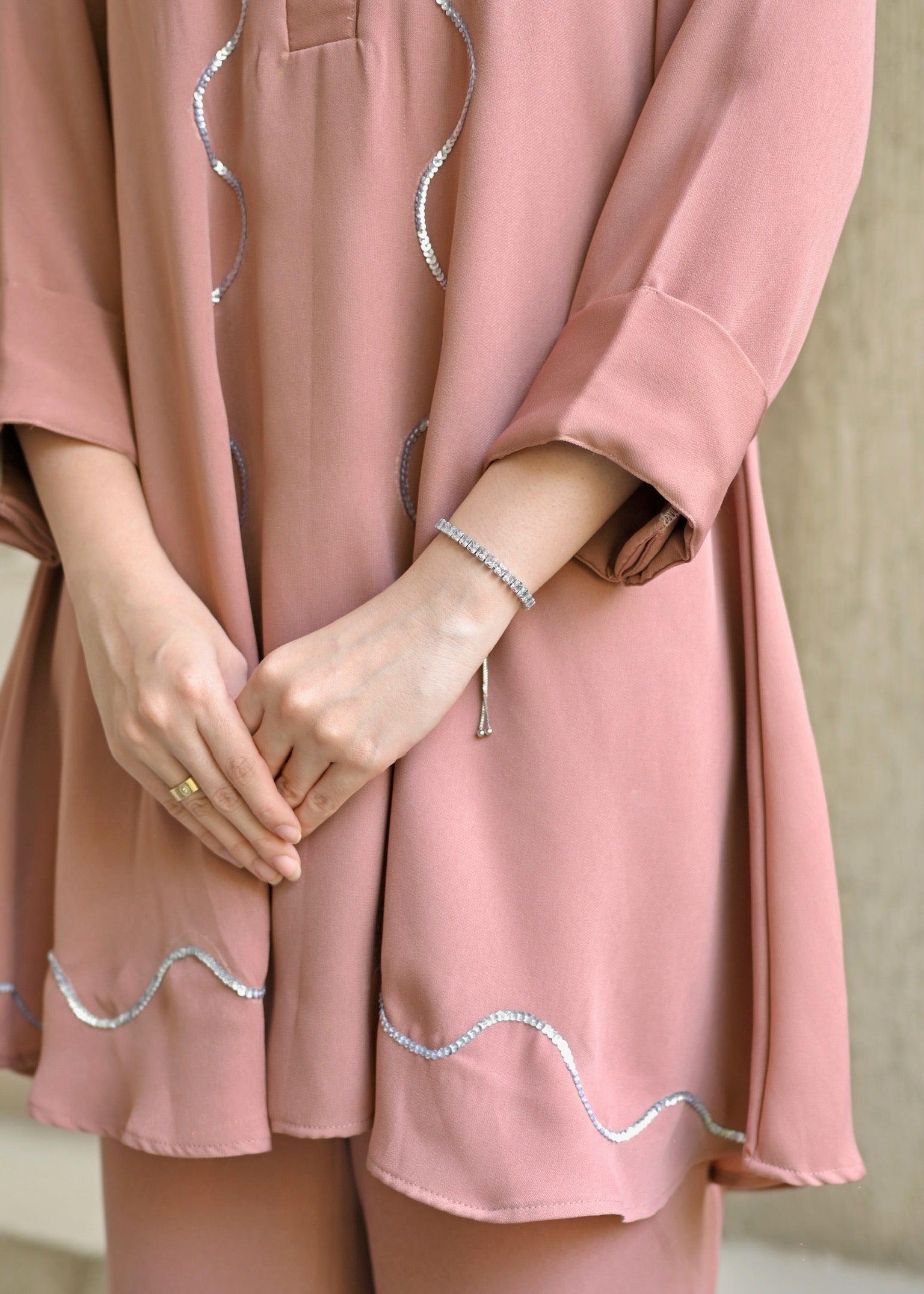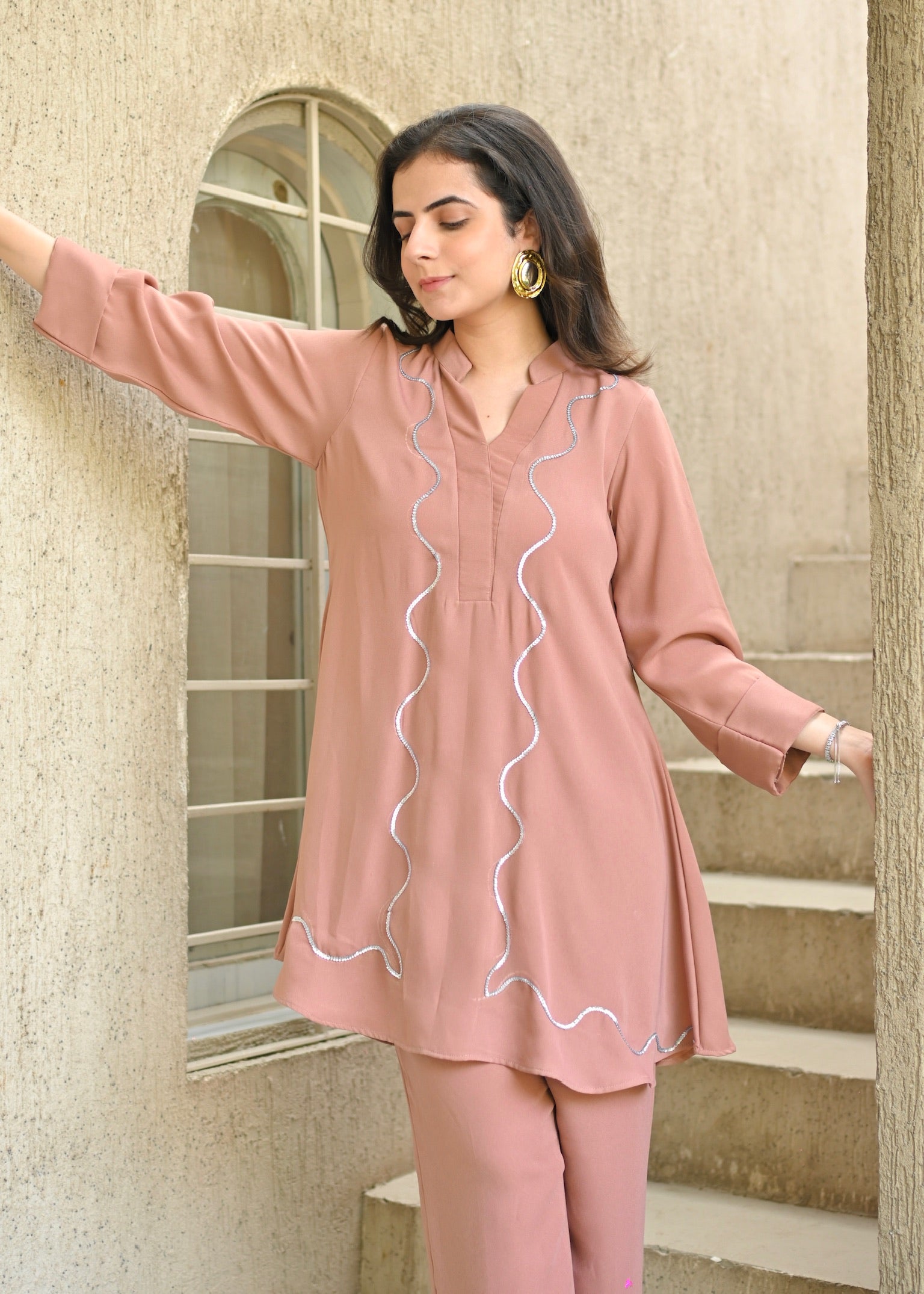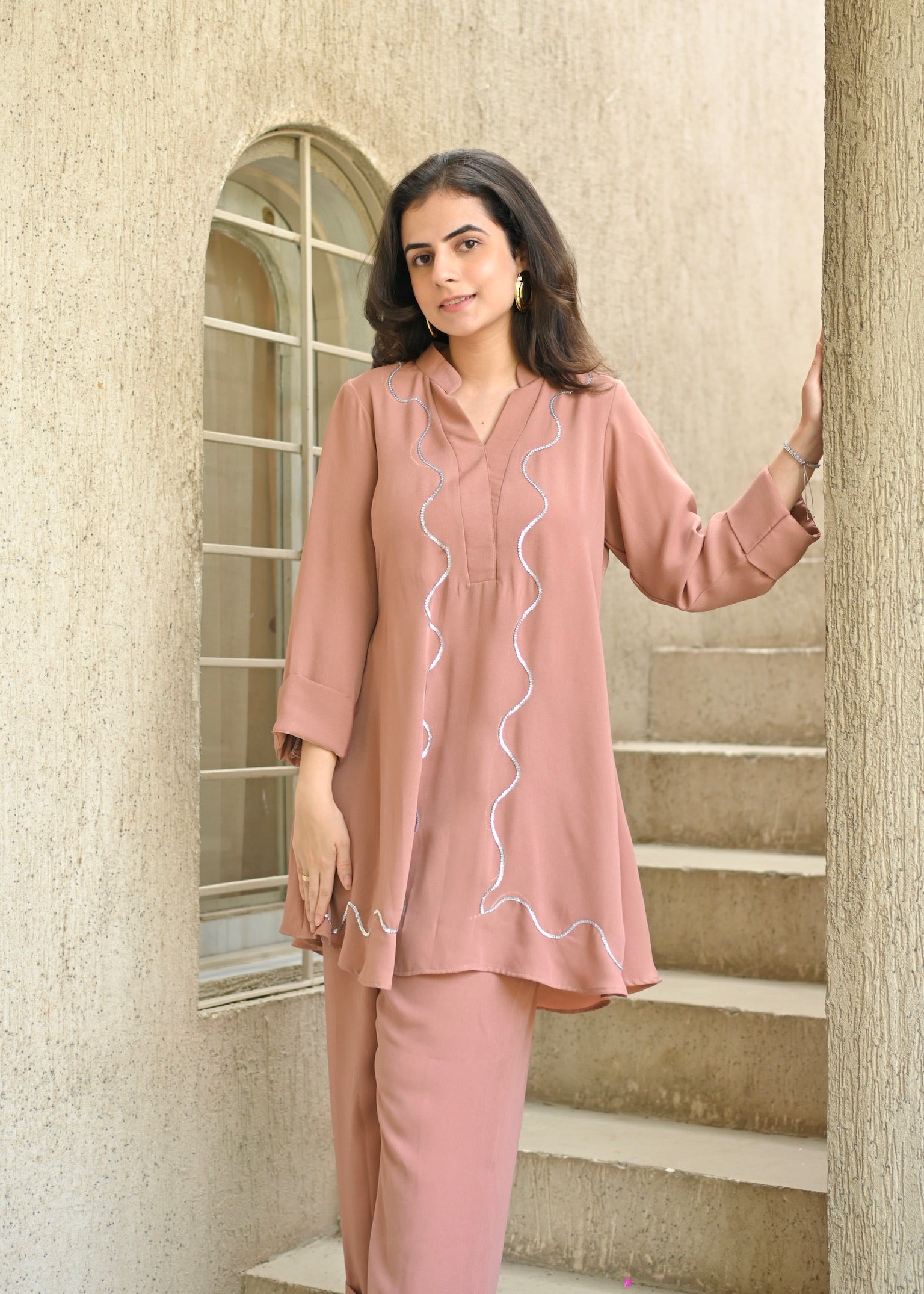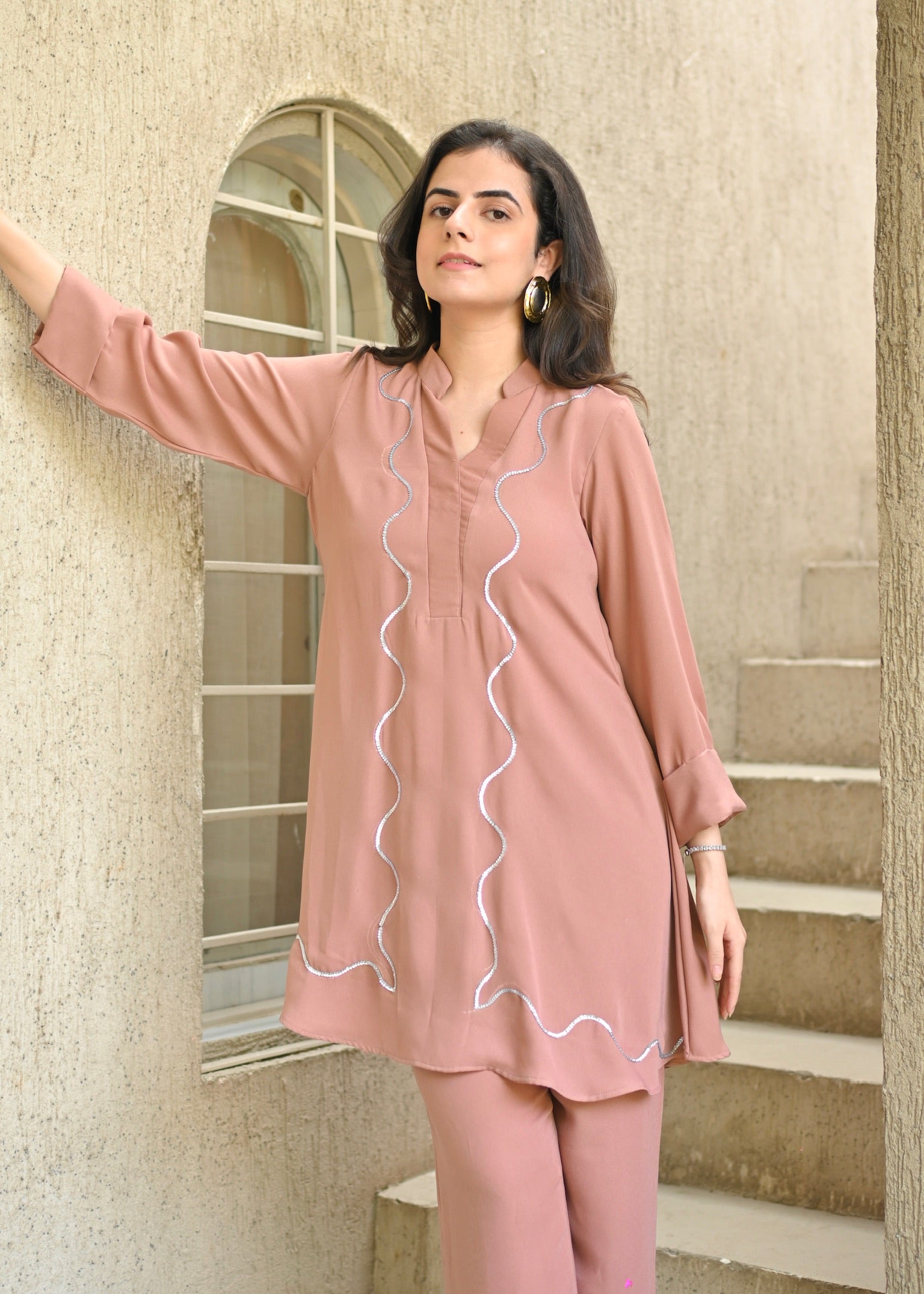 Effortlessly elegant and lightweight, our Blush Wave Co-ord Set is crafted from premium double georgette for a fluid, flattering drape. The soft blush hue is adorned with delicate hand-embroidered sequin detailing that adds a subtle shimmer to your look. Designed for comfort and sophistication, this two-piece set features a flowy A-line top with wavy embroidery and relaxed straight pants — perfect for brunches, festive gatherings, or evening soirées.