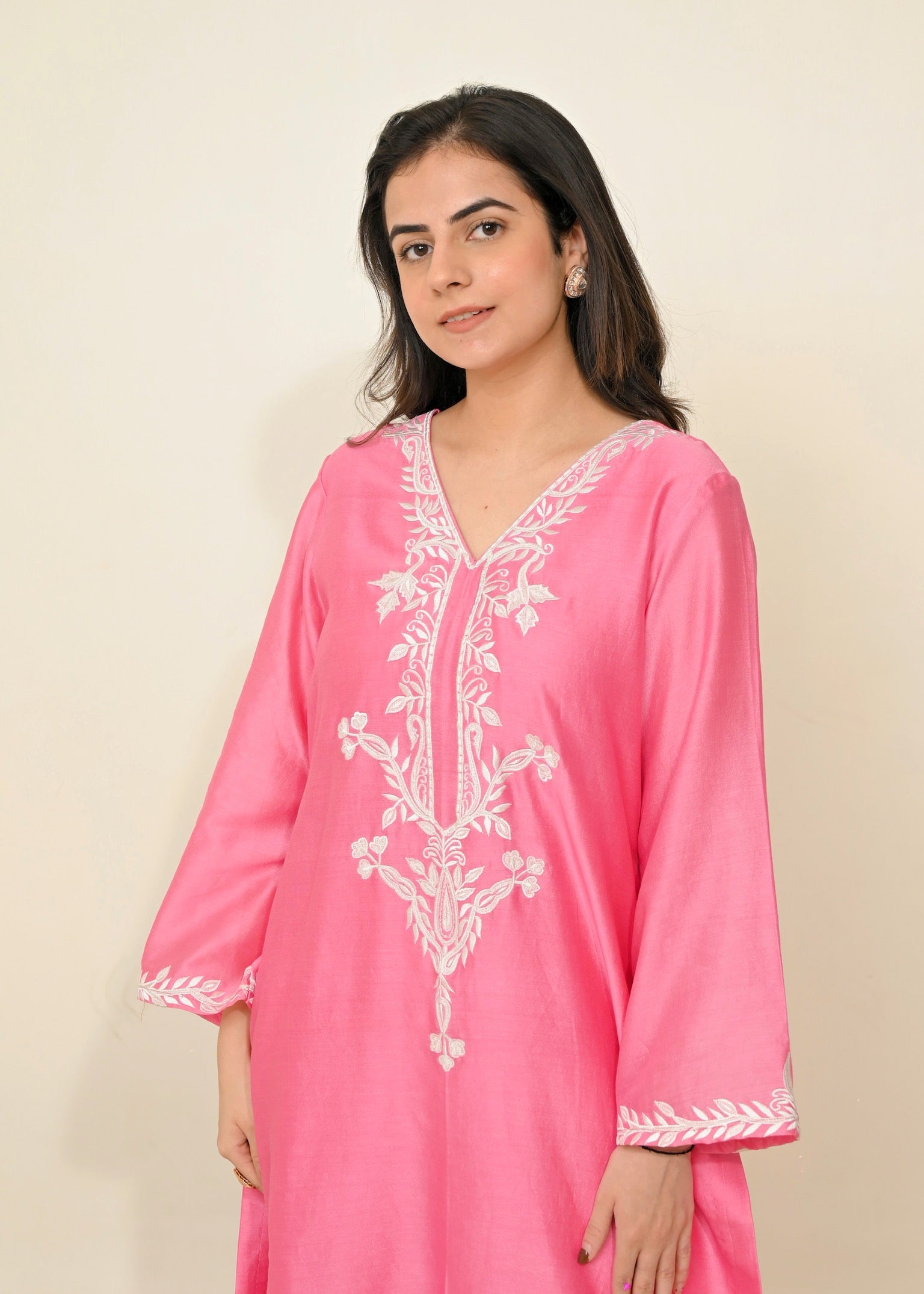 Step into effortless grace with the Gulroz suit set — a celebration of vibrant charm and subtle craftsmanship. Crafted in pure chanderi fabric, this bright pink outfit features white hand embroidery on the neckline and sleeves, giving it a refined yet youthful look. Paired with a pure organza dupatta, this ensemble is lightweight, breathable, and perfect for warm-weather occasions.