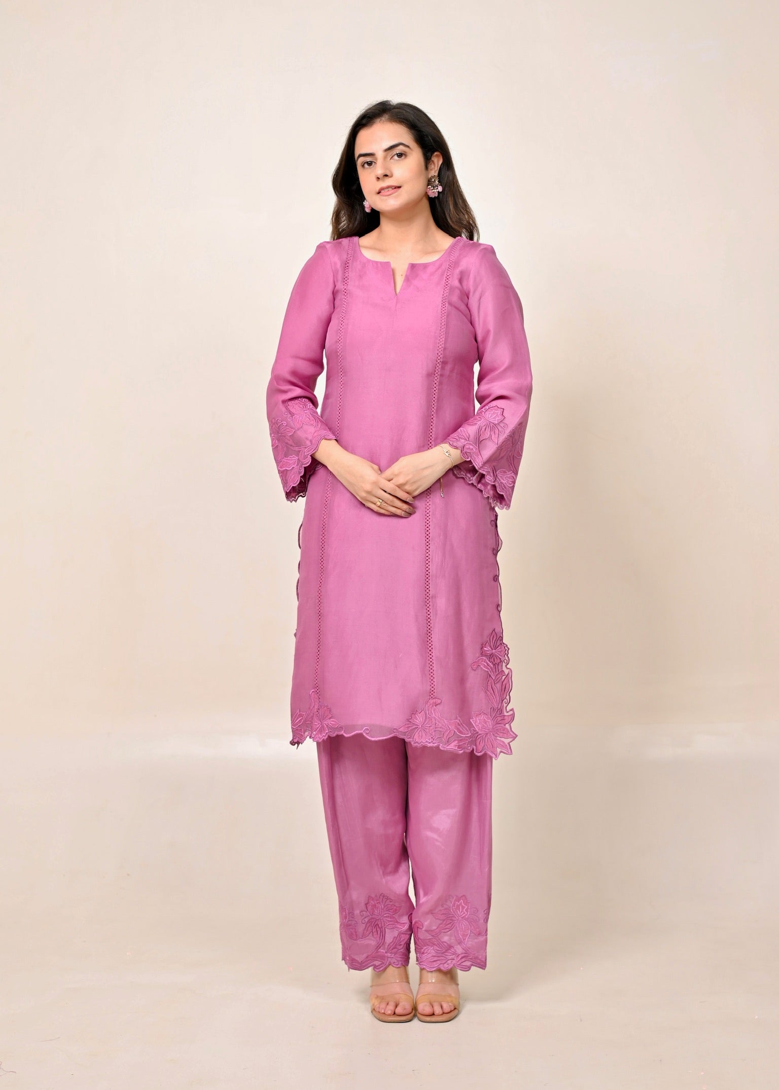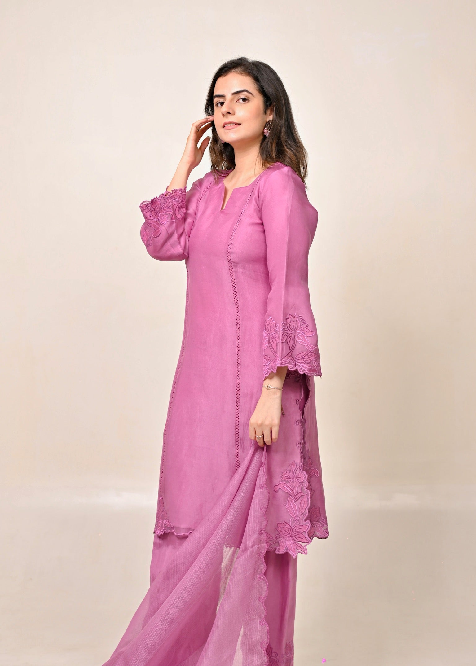 Step into elegance with The Flower Lady’s Mauve Pure Organza Ensemble — a refined three-piece set crafted from pure organza fabric. The kurta and salwar feature delicate tonal thread embroidery, exuding understated grace and sophistication. A beautifully finished lace-detailed dupatta adds a touch of feminine charm, making this outfit perfect for festive gatherings, daytime celebrations, or elegant evenings.