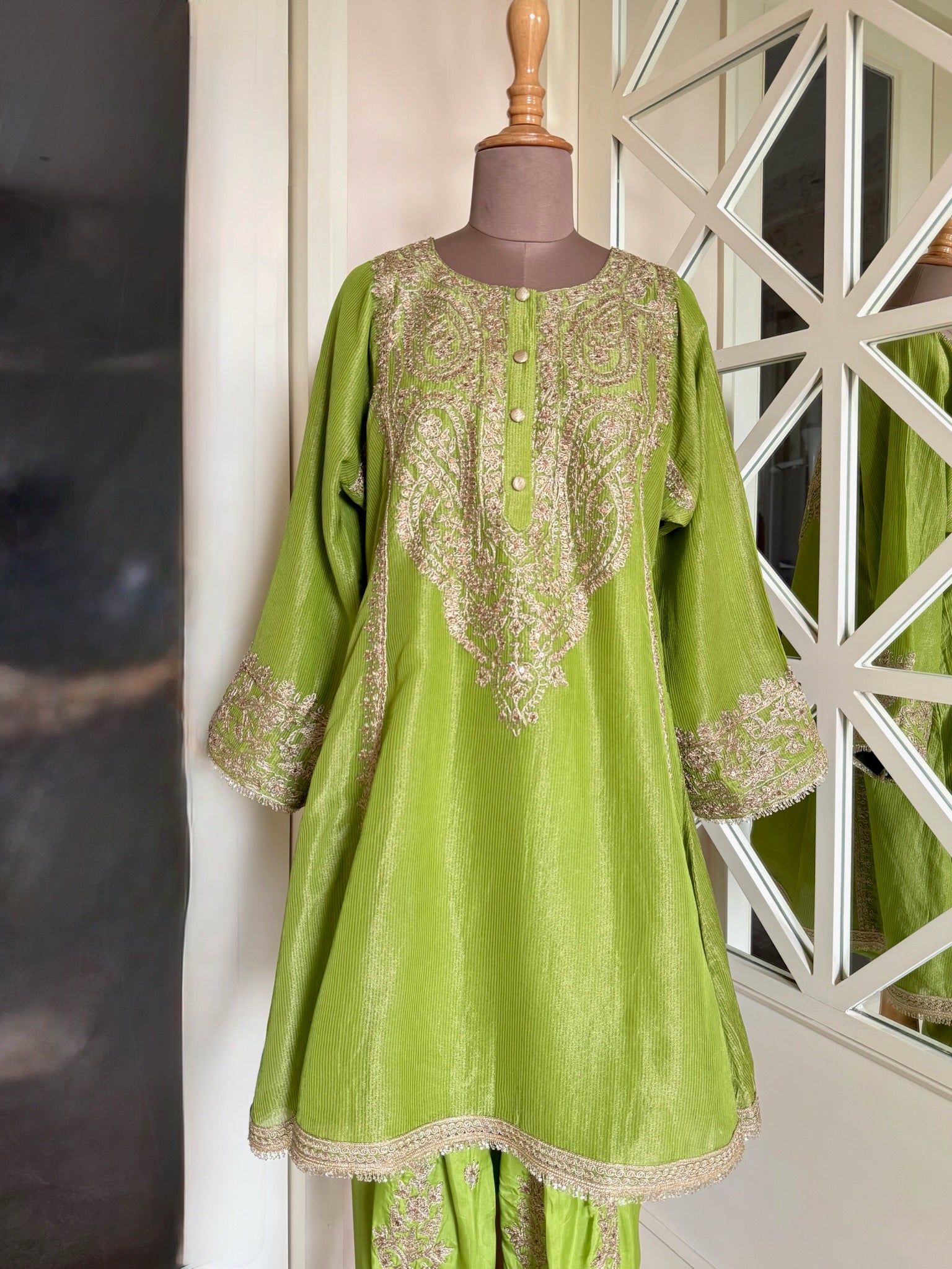 Step into elegance with our Meadow Glow suit set, crafted in pure organza with a crepe straight salwar and a pure organza dupatta. The ensemble is highlighted with intricate dori and sequin embroidery, exuding timeless charm. The dupatta features a delicate contrast lace with bottle green finishing, adding a subtle statement touch. Perfect for festive gatherings or evening occasions, this outfit beautifully blends tradition with sophistication.