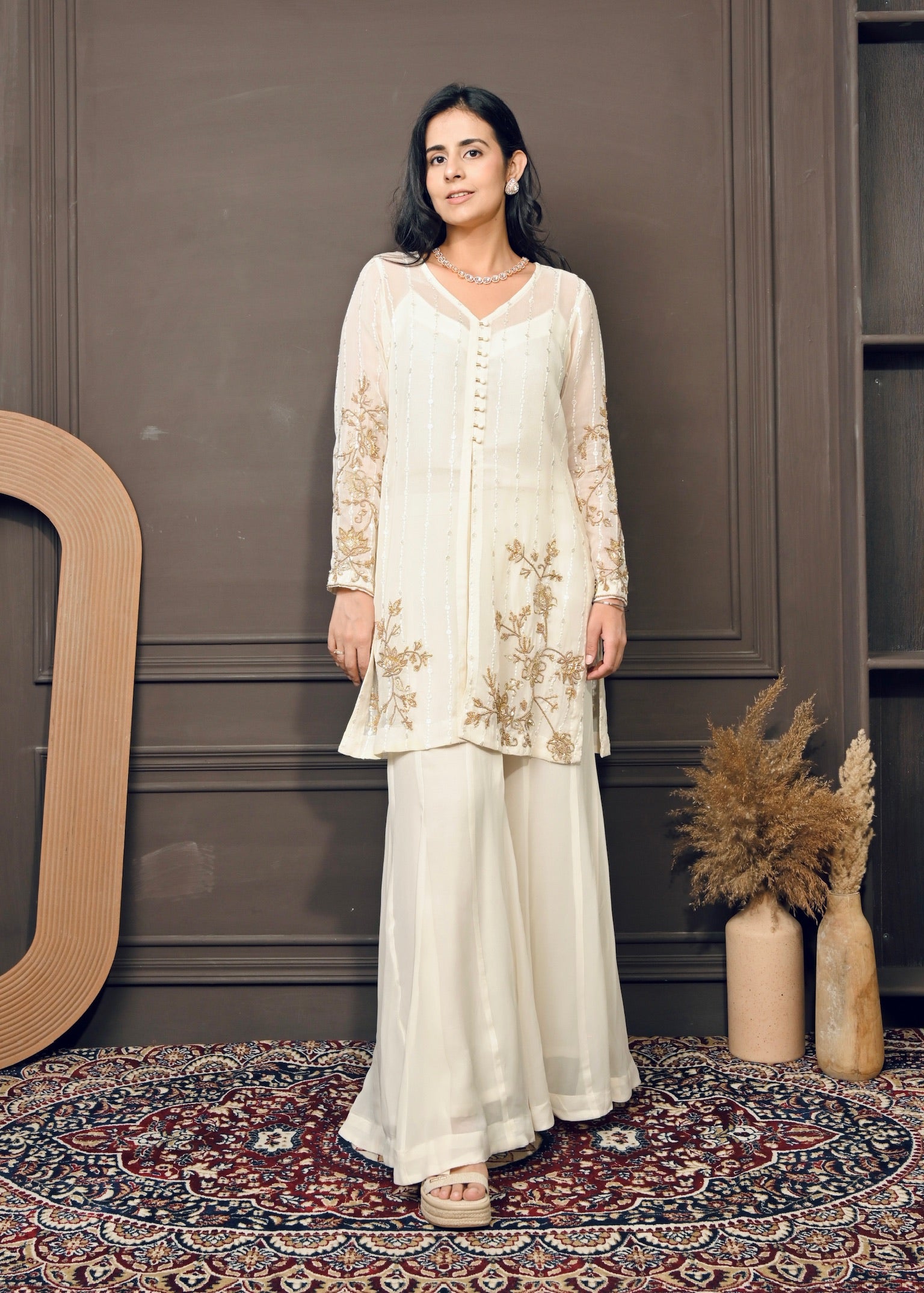 An elegant ivory ensemble crafted in soft georgette, Noor-e-Safa is the epitome of grace and refinement. The kurta is delicately adorned with thread and sequin embroidery in a warm gold tone, complemented by fabric buttons for a timeless touch. Paired with a flowy sharara and an organza-trimmed dupatta, this set is perfect for intimate gatherings, day weddings, or festive soirées.