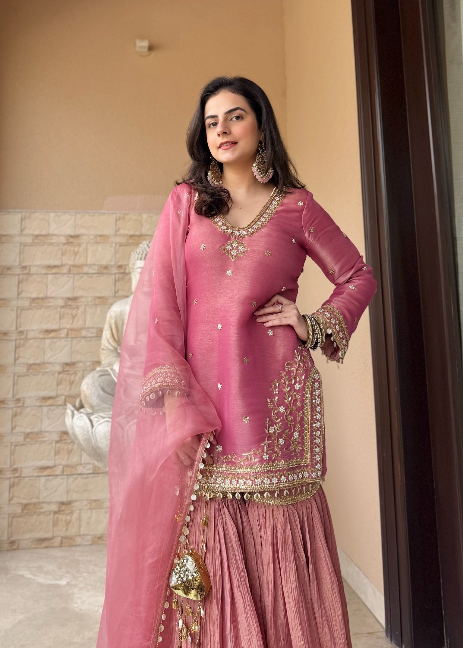 It is paired with a beautifully flared crushed tissue gharara, creating graceful movement and a flattering, regal fall.