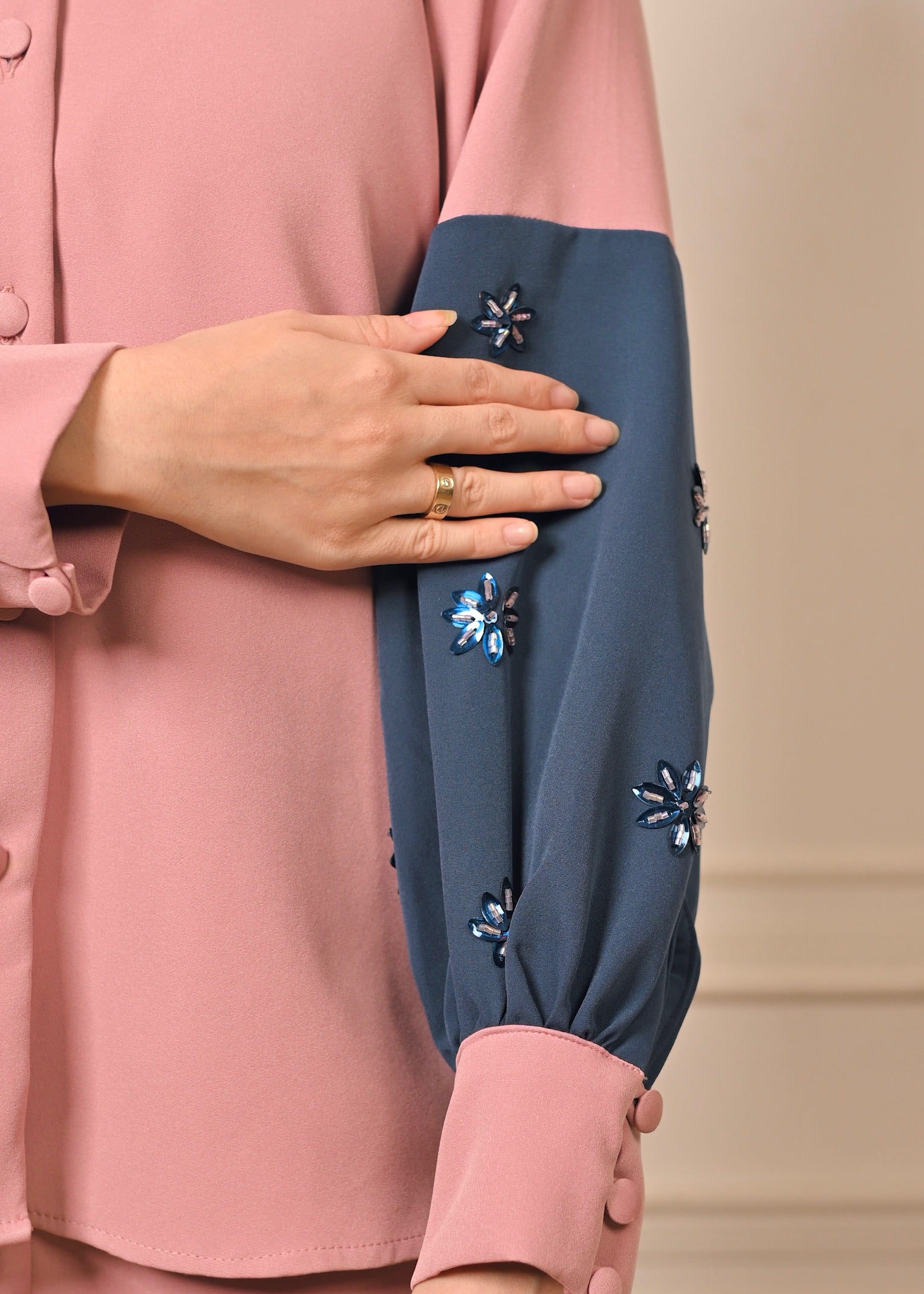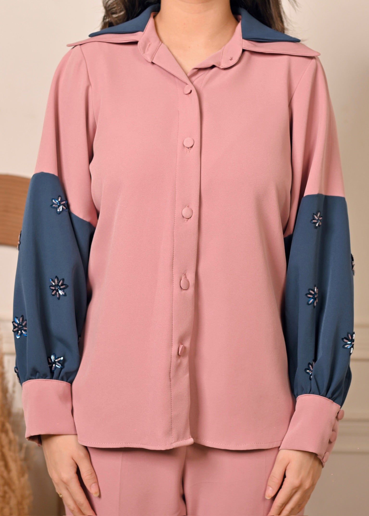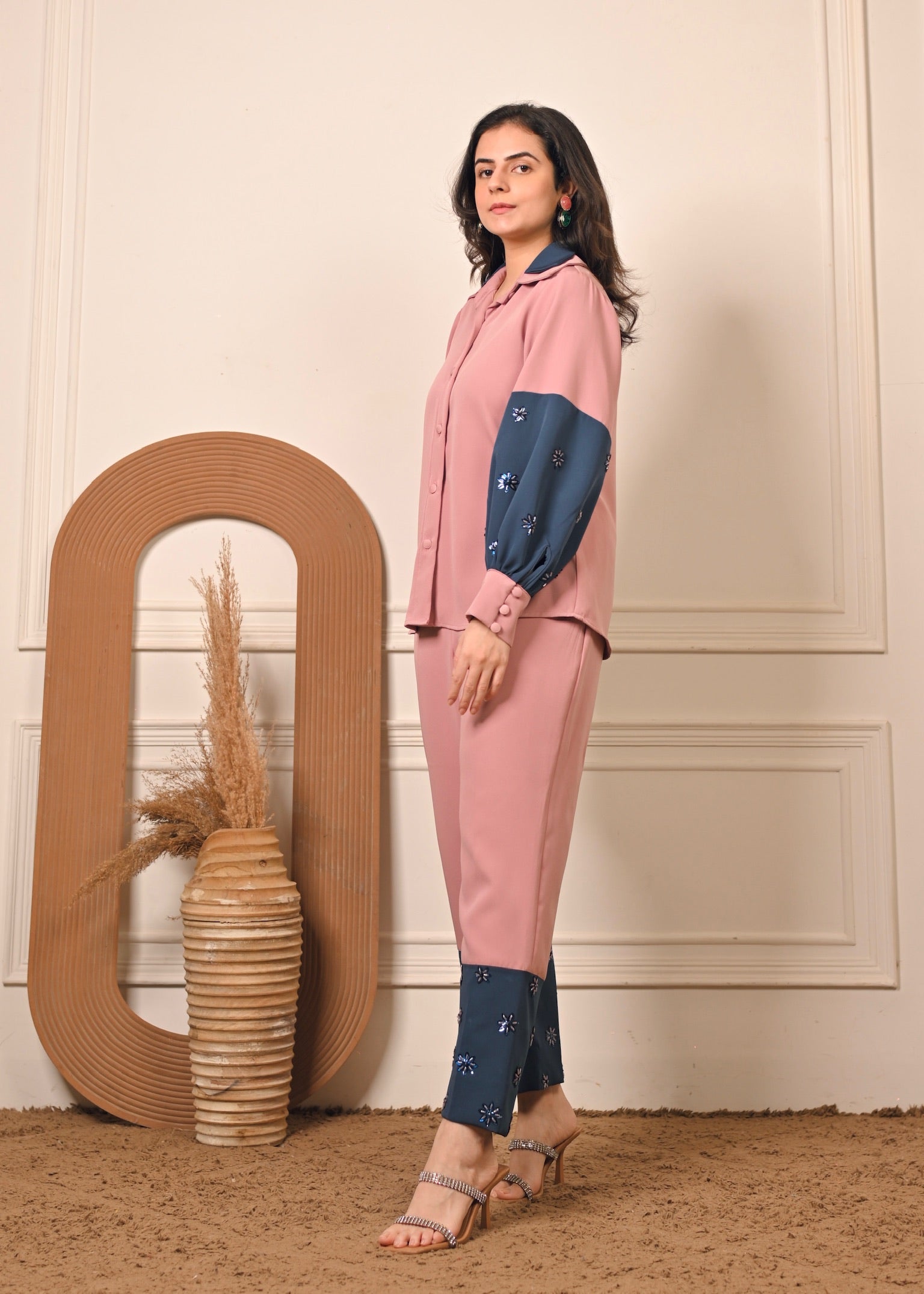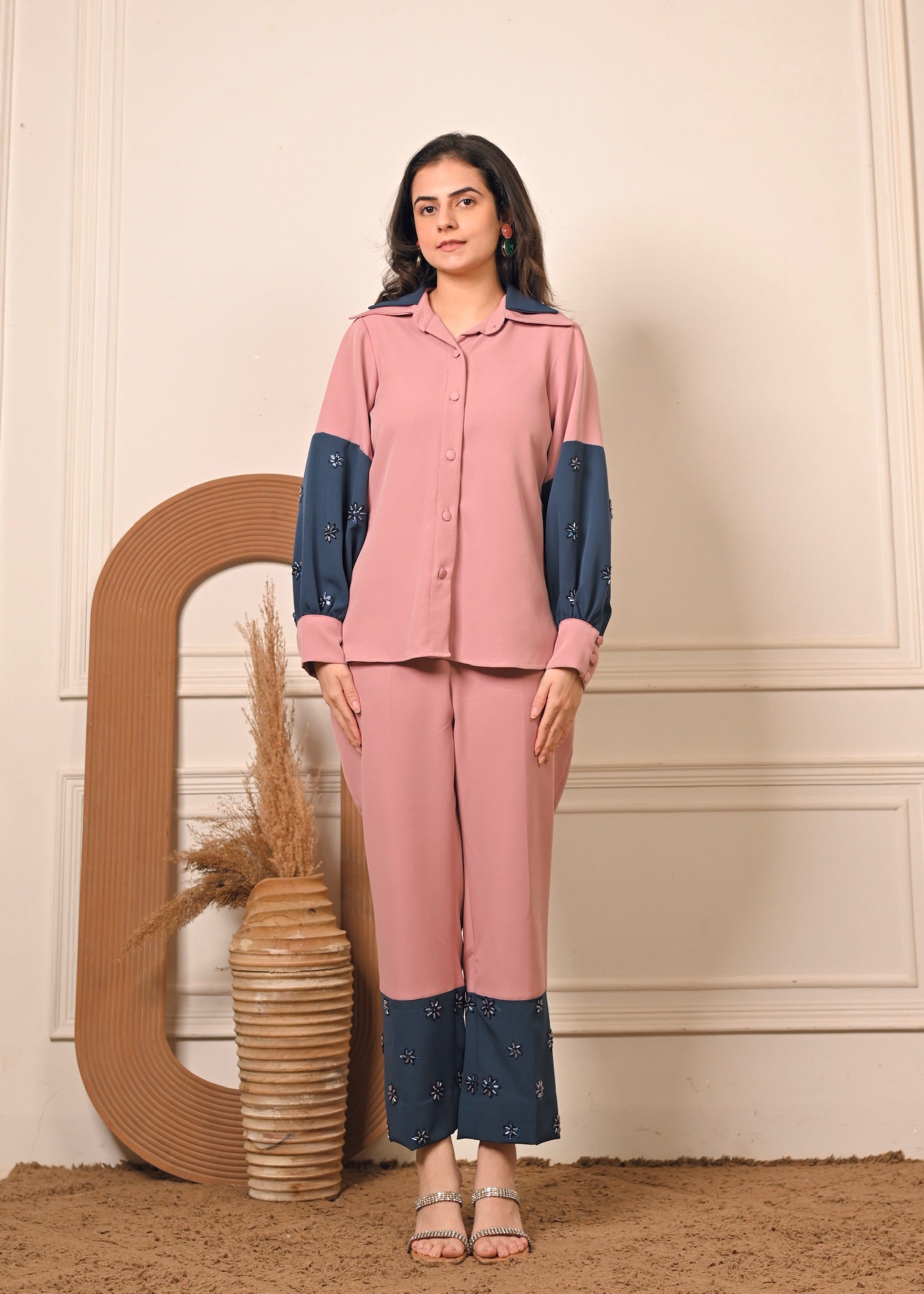 Step into effortless elegance with our Rose Noir co-ord set, tailored in soft banana lycra for a sleek yet comfortable fit. The soothing rose pink base is elevated with contrasting navy panels on the sleeves and pant hems, delicately adorned with hand embroidery. Perfect for brunches, casual outings, or travel, this chic fusion ensemble combines minimal sophistication with a hint of handcrafted charm.