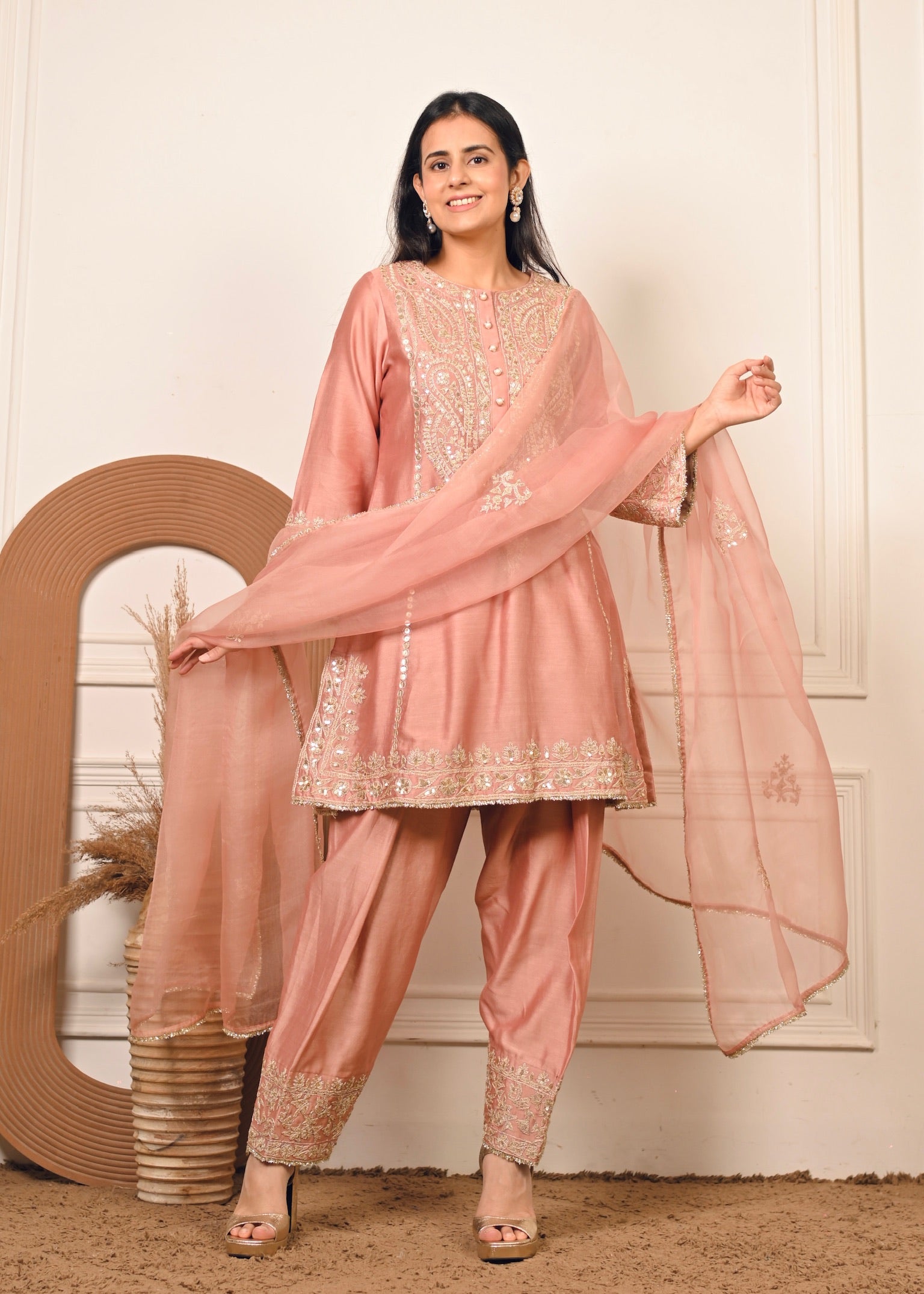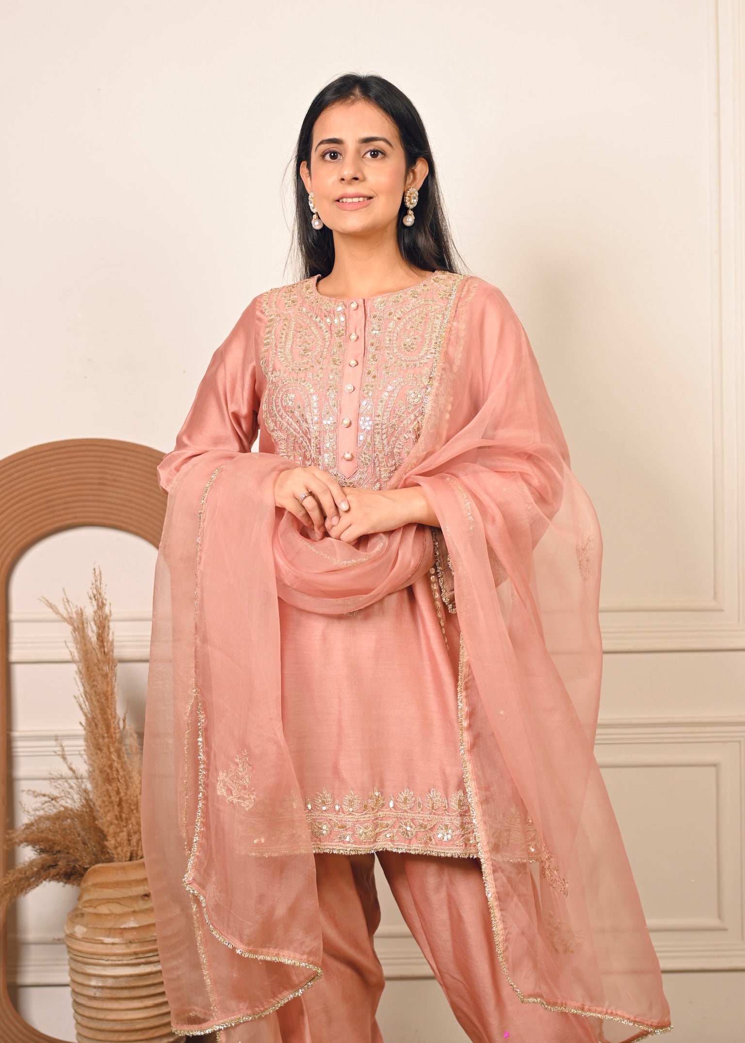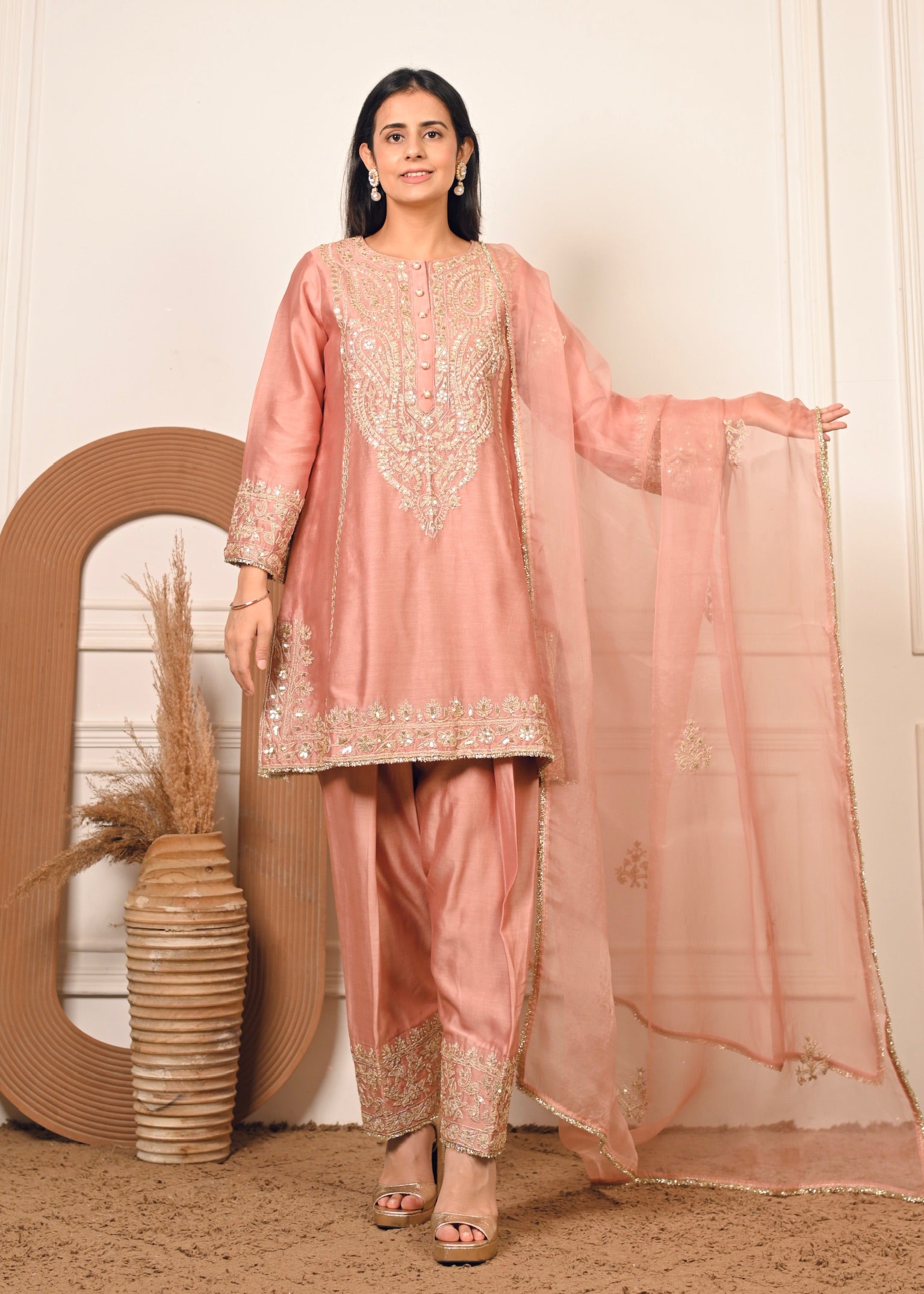 A vision of timeless grace — Sheesh Gulaab is crafted in pure chanderi and adorned with delicate dori embroidery that reflects subtle elegance. The pastel rose hue adds a soft feminine charm, while the pure organza dupatta completes the look with its sheer sophistication. Perfect for festive gatherings, intimate celebrations, or graceful daytime occasions.