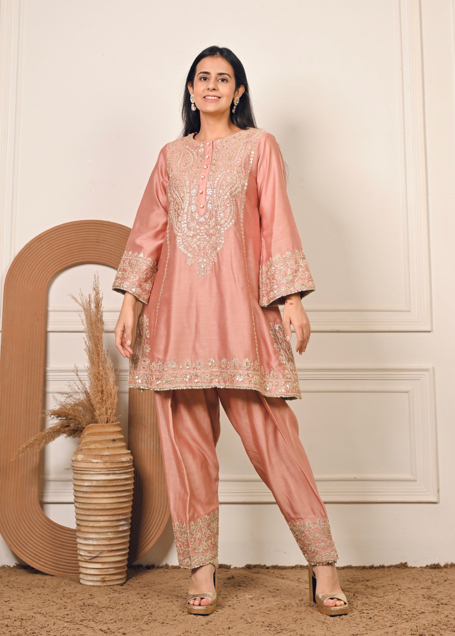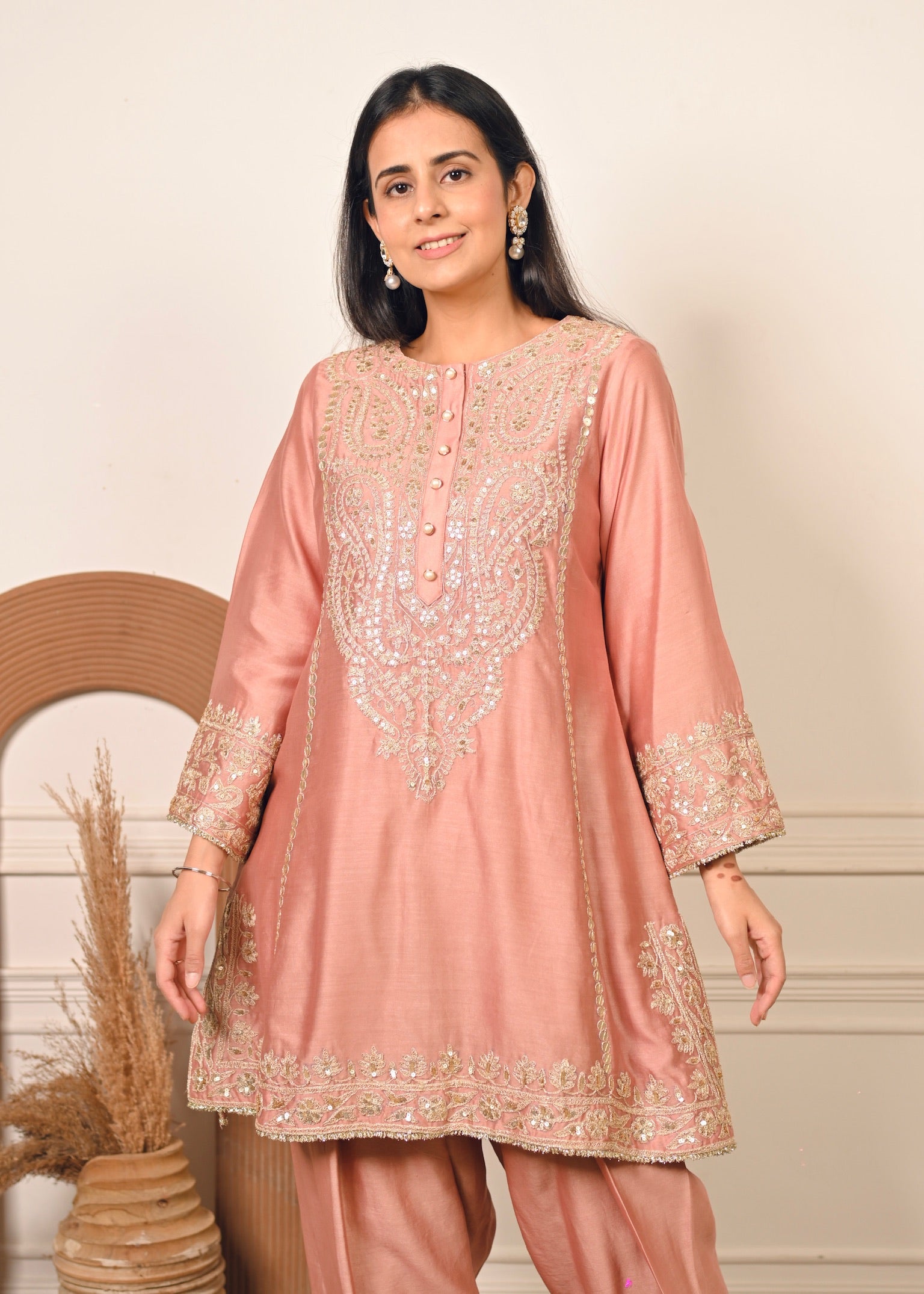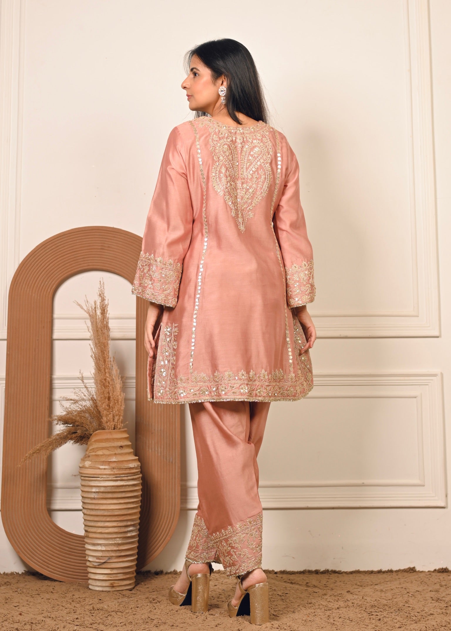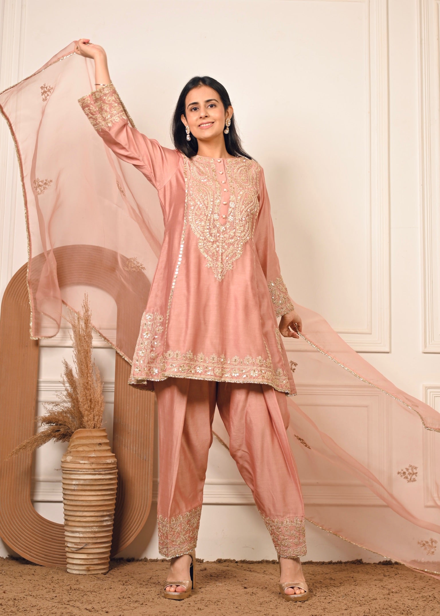 A vision of timeless grace — Sheesh Gulaab is crafted in pure chanderi and adorned with delicate dori embroidery that reflects subtle elegance. The pastel rose hue adds a soft feminine charm, while the pure organza dupatta completes the look with its sheer sophistication. Perfect for festive gatherings, intimate celebrations, or graceful daytime occasions.