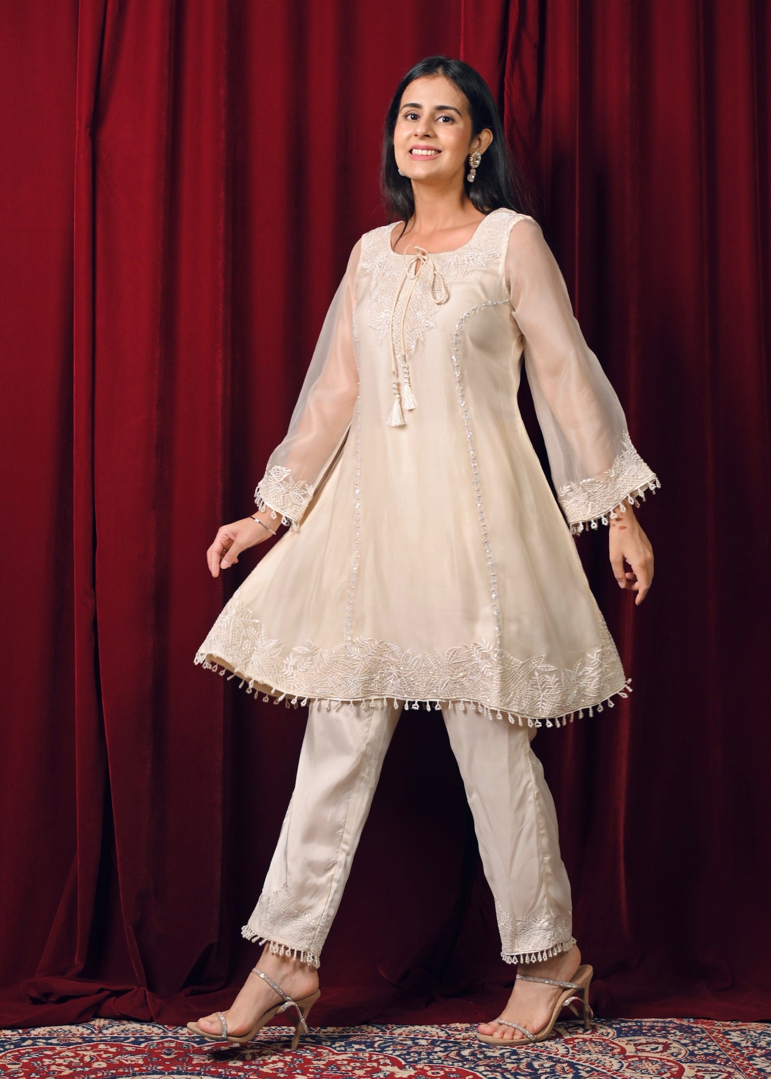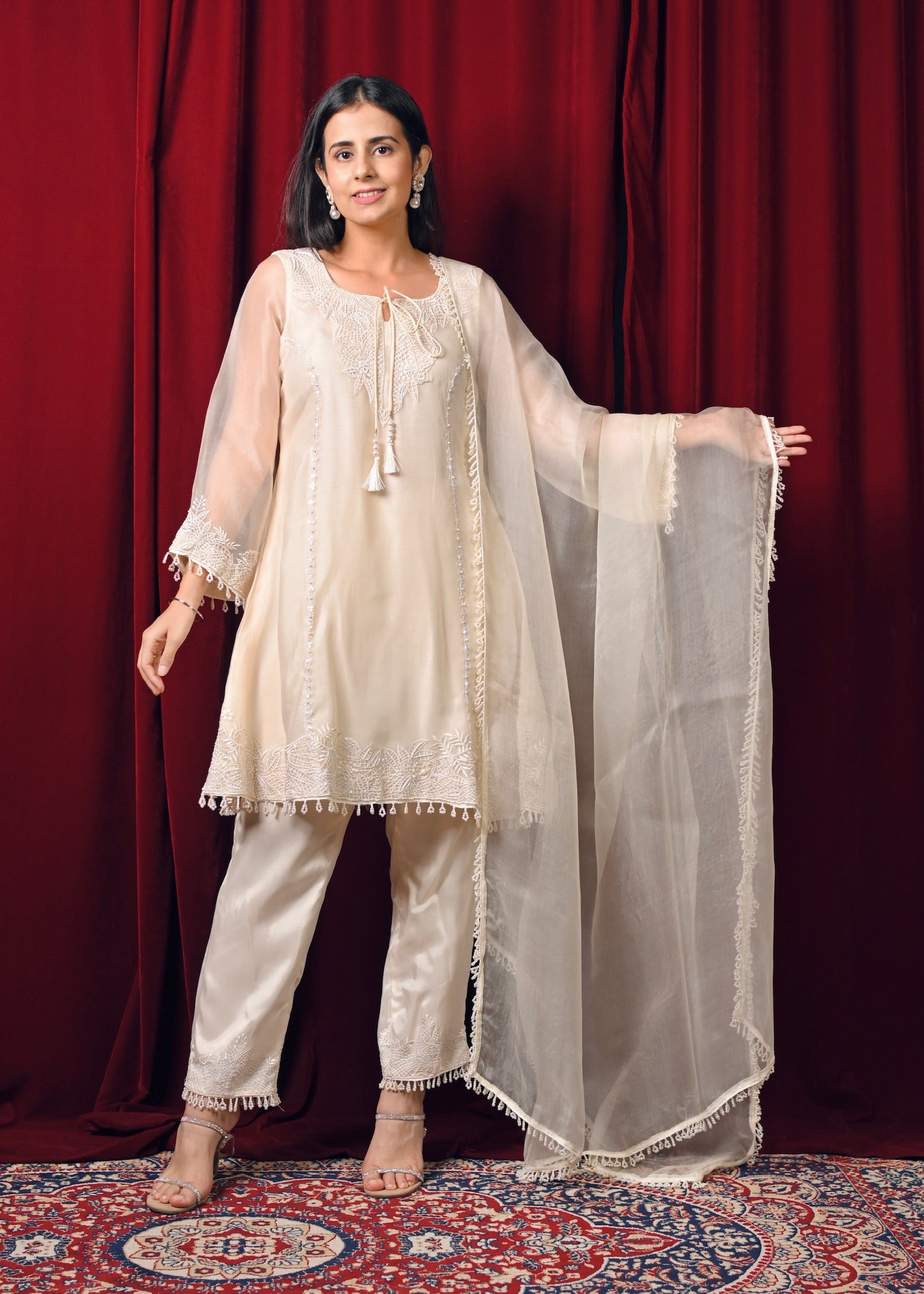 Pure organza kurta and trousers paired with a pure organza dupatta, offering a soft, sheer and luxurious drape.