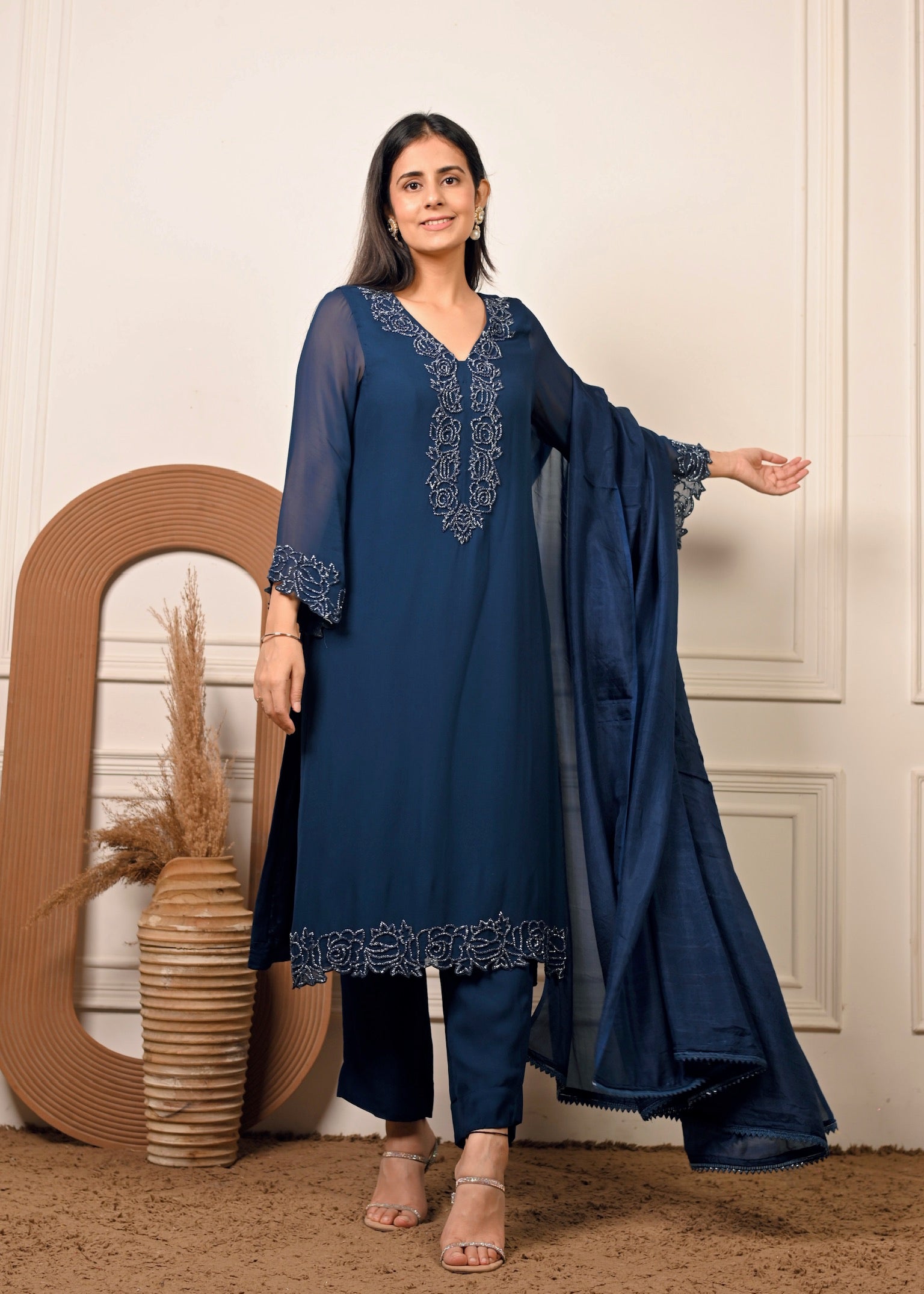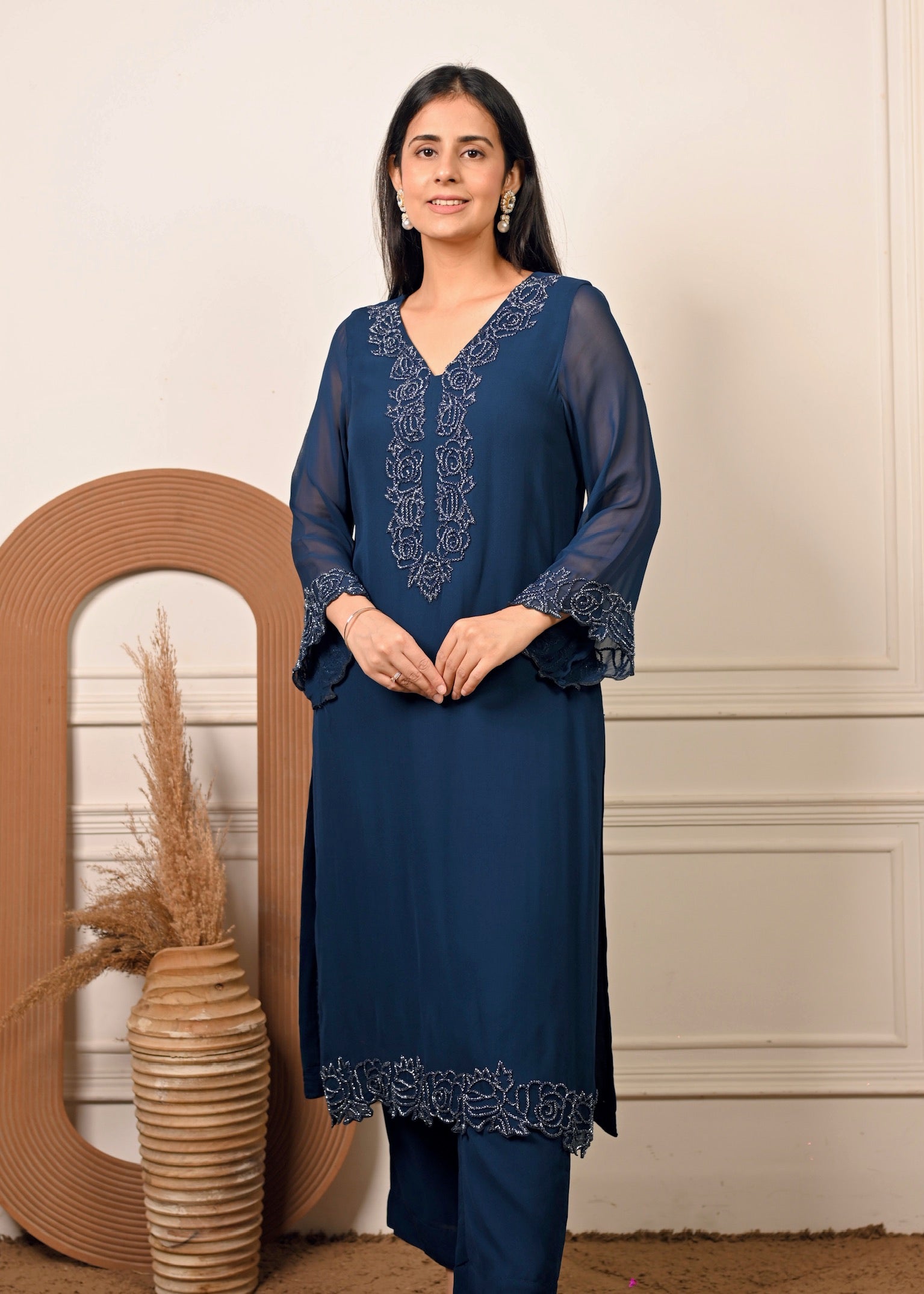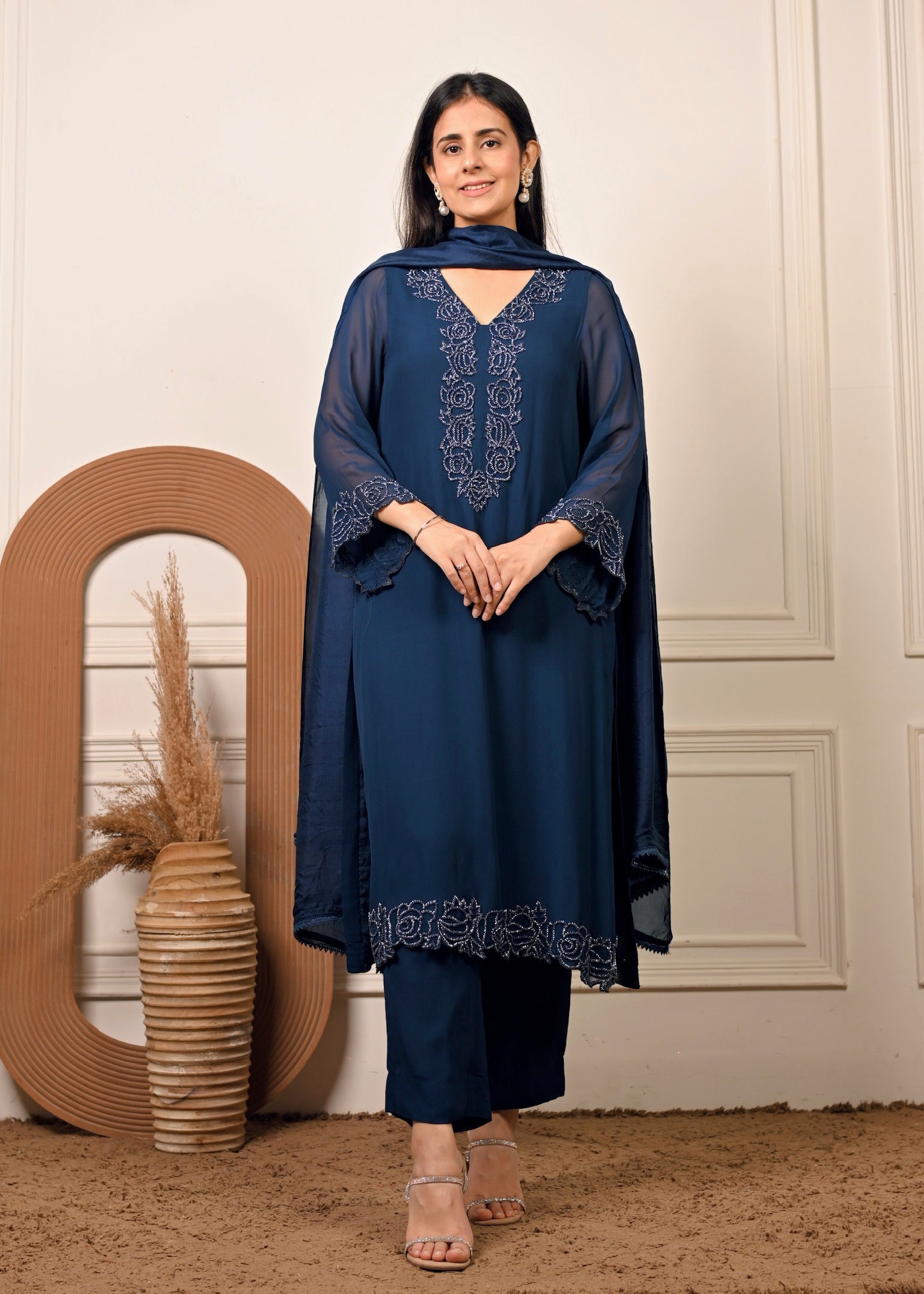 Radiate effortless grace in Sheesh Noir — a timeless georgette ensemble in a rich noir hue. The kurta features delicate hand embroidery that adds a touch of luxury to its fluid silhouette. Paired with a matching georgette dupatta, this set is perfect for festive evenings and elegant celebrations.