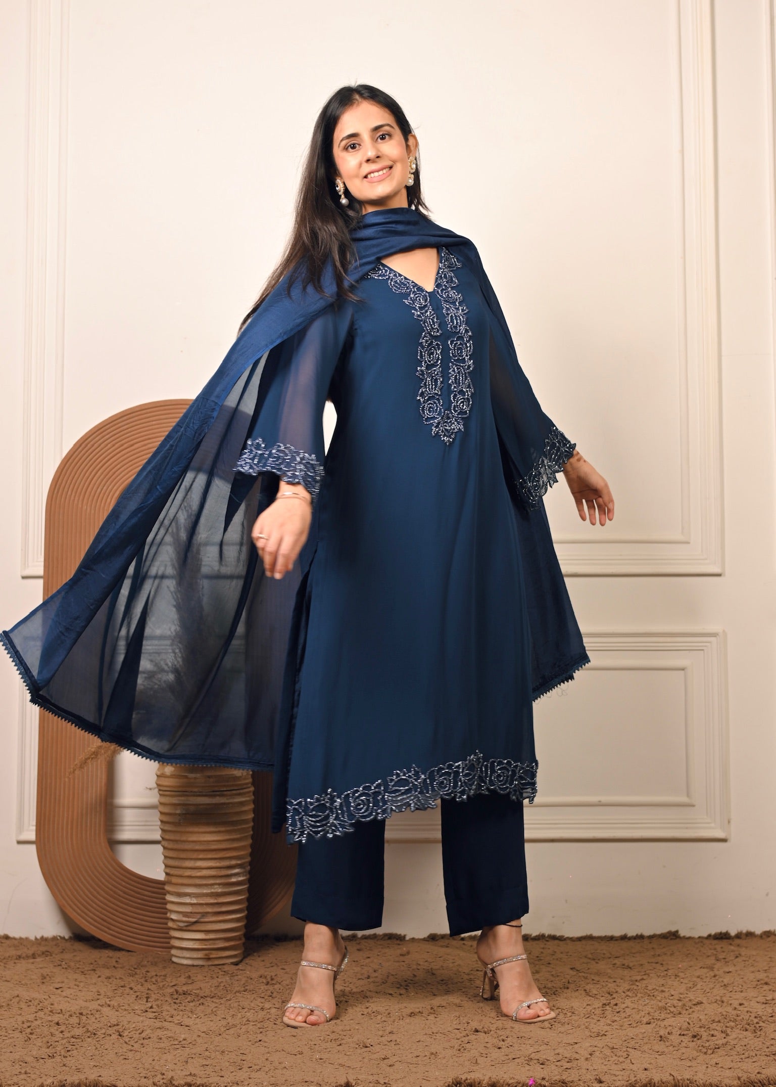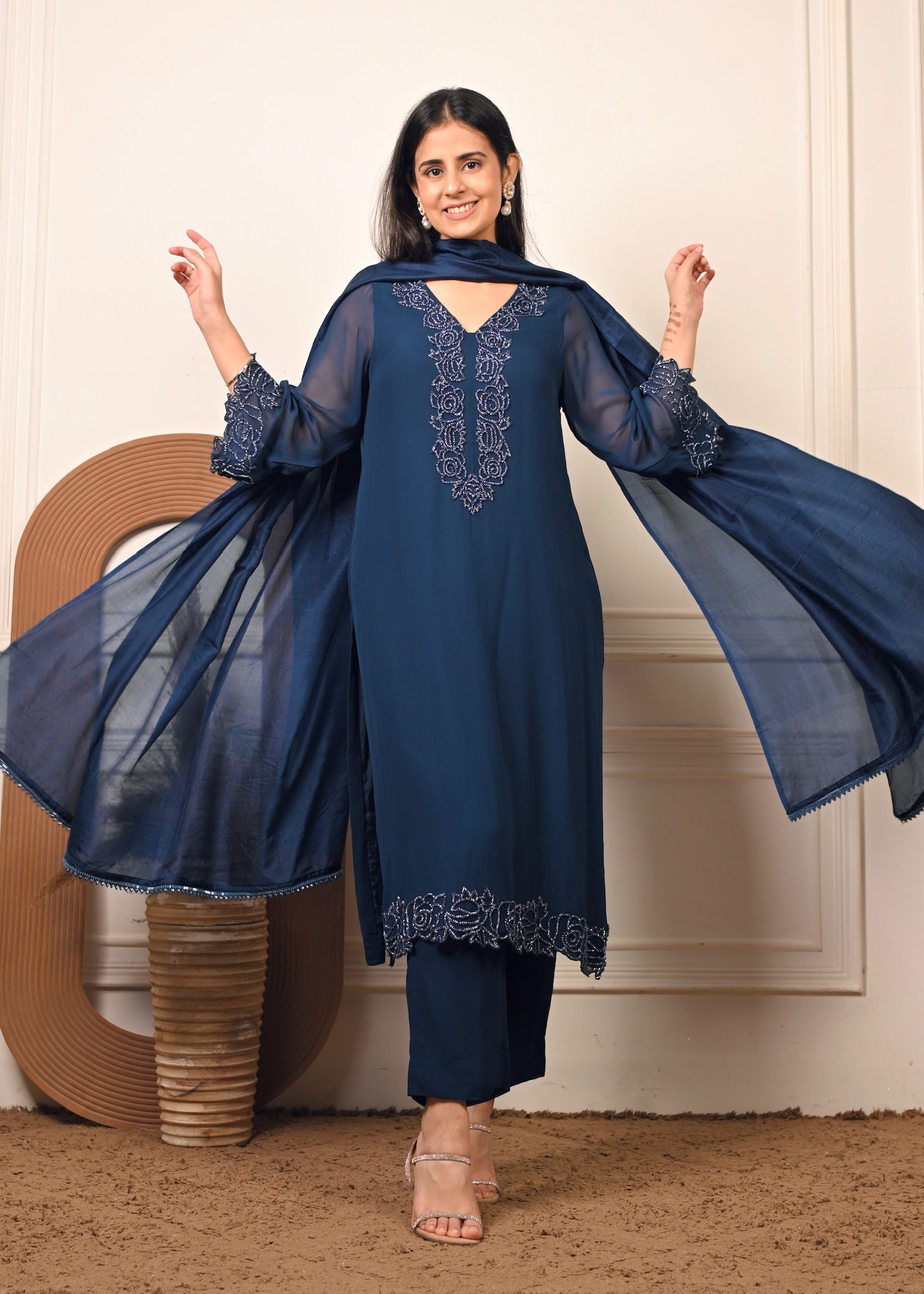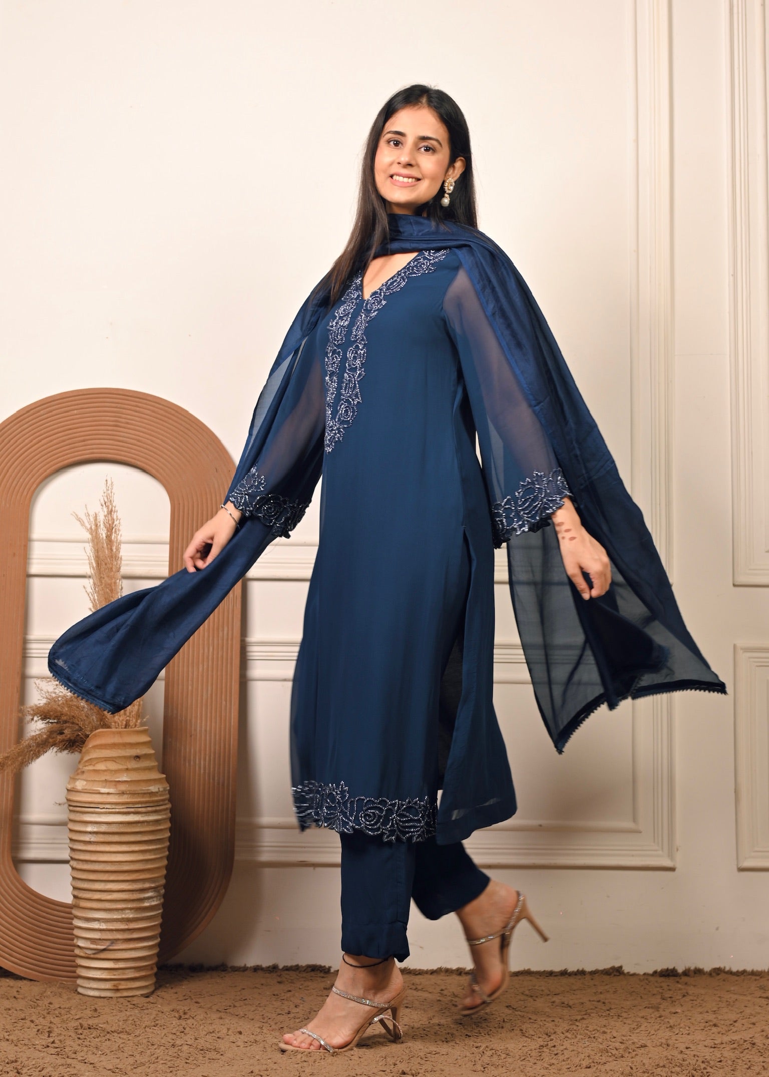 Radiate effortless grace in Sheesh Noir — a timeless georgette ensemble in a rich noir hue. The kurta features delicate hand embroidery that adds a touch of luxury to its fluid silhouette. Paired with a matching georgette dupatta, this set is perfect for festive evenings and elegant celebrations.