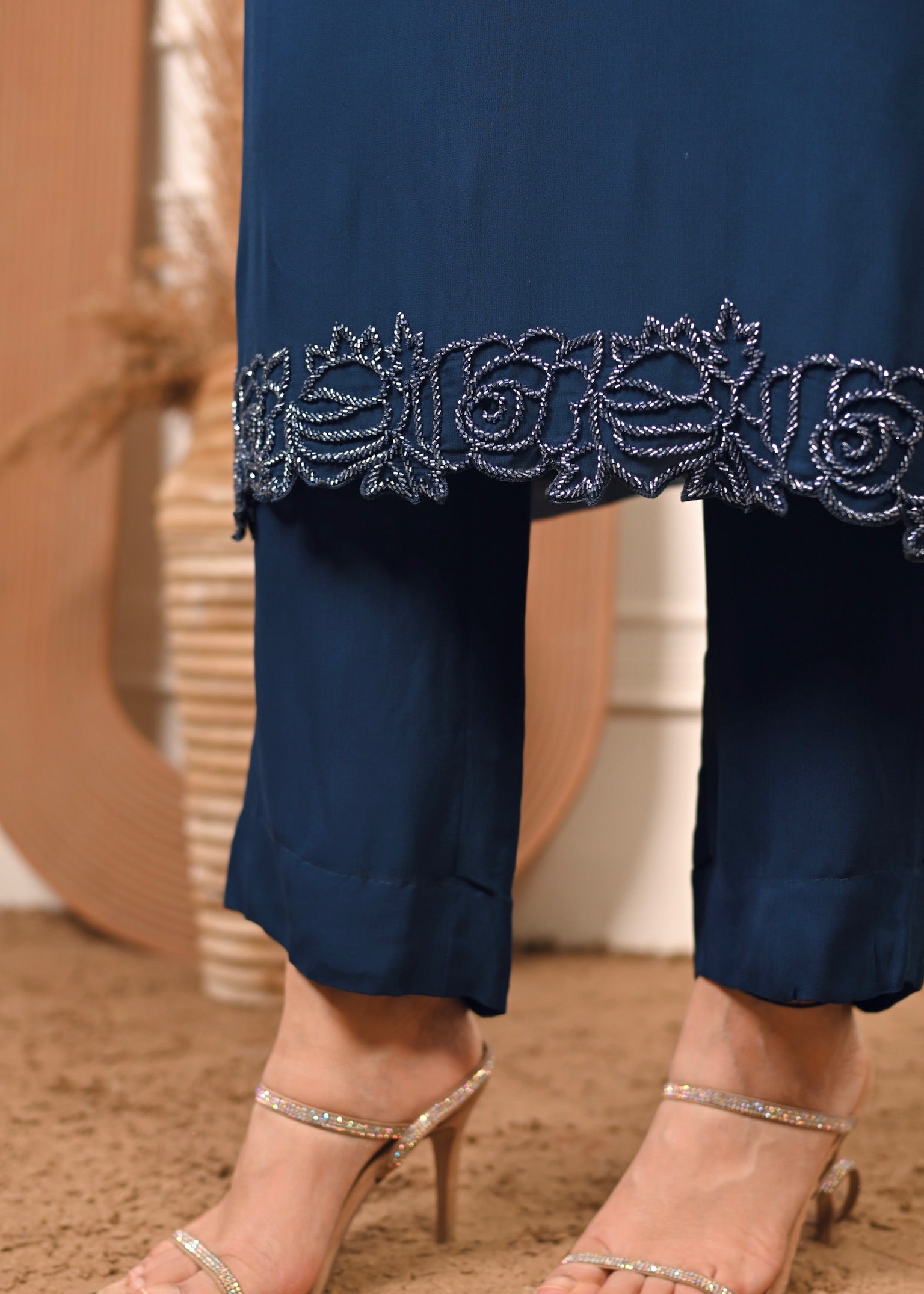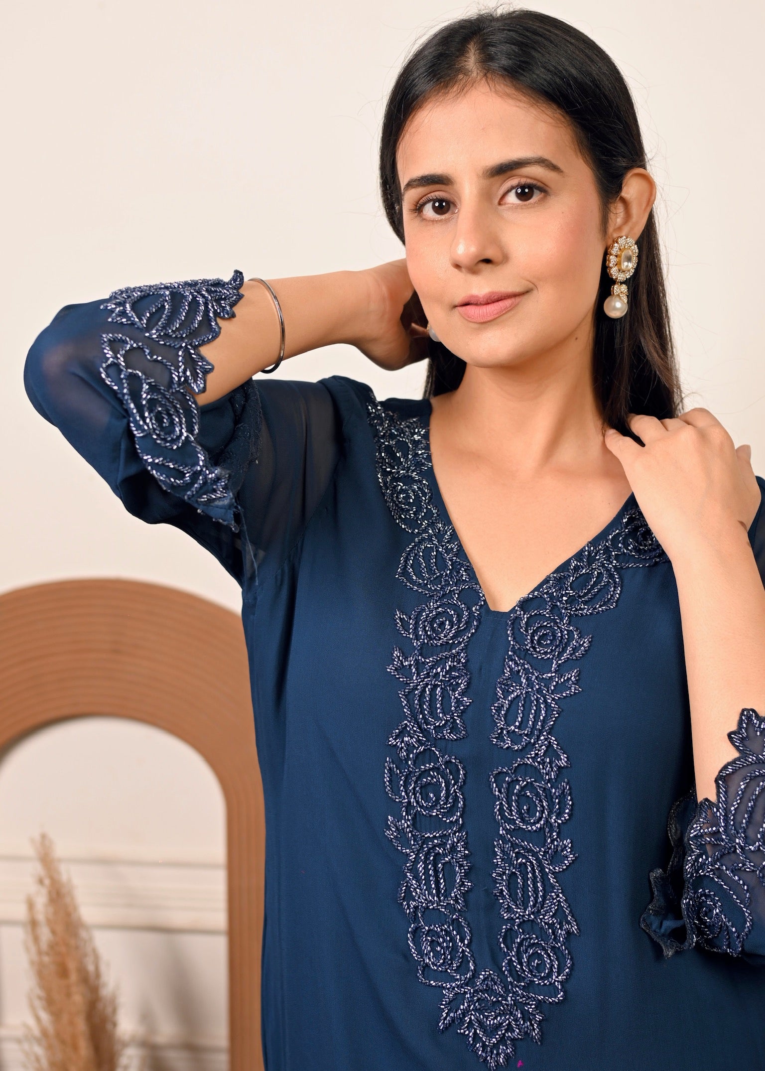 Intricate hand embroidery on neckline, sleeves & hem