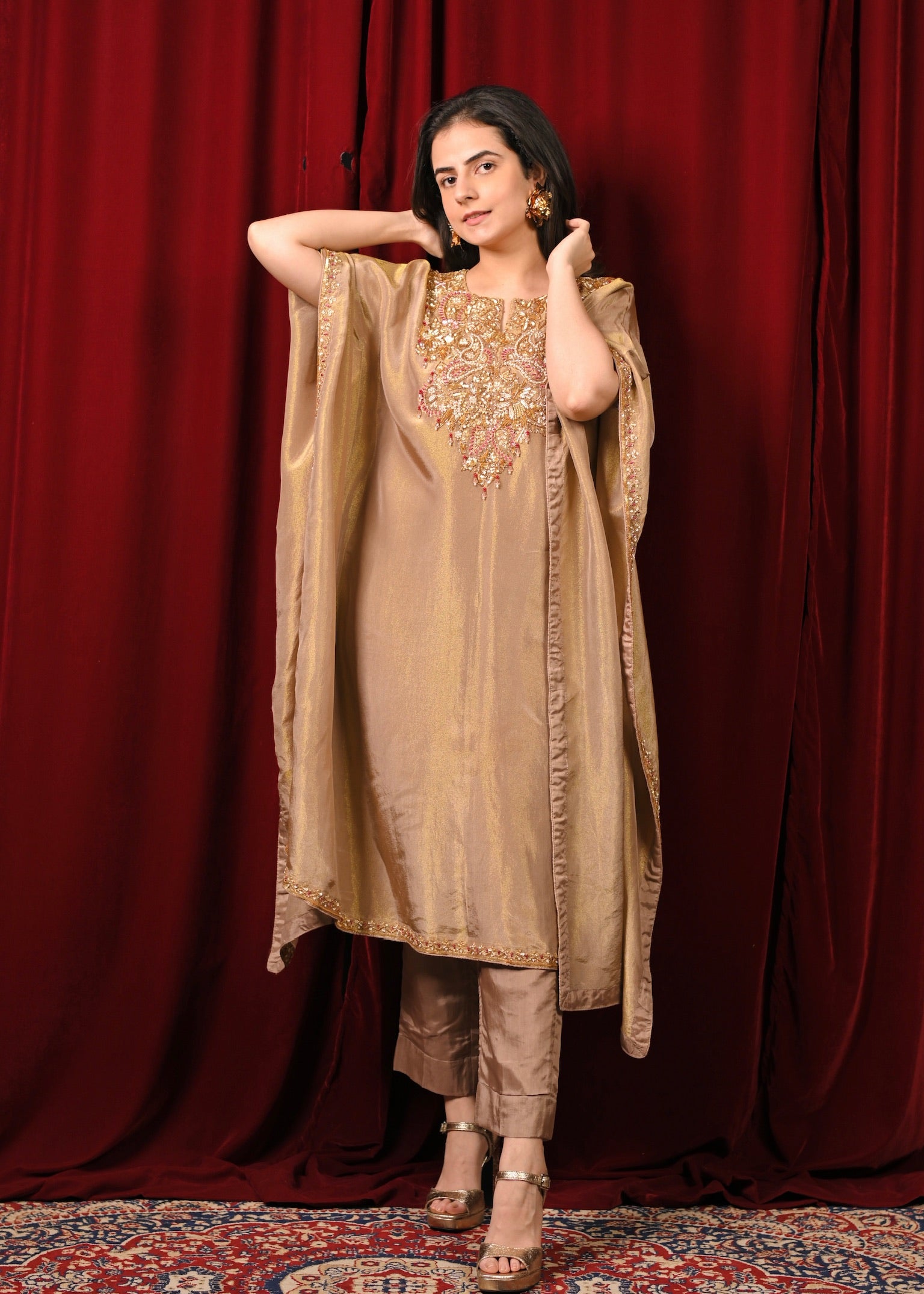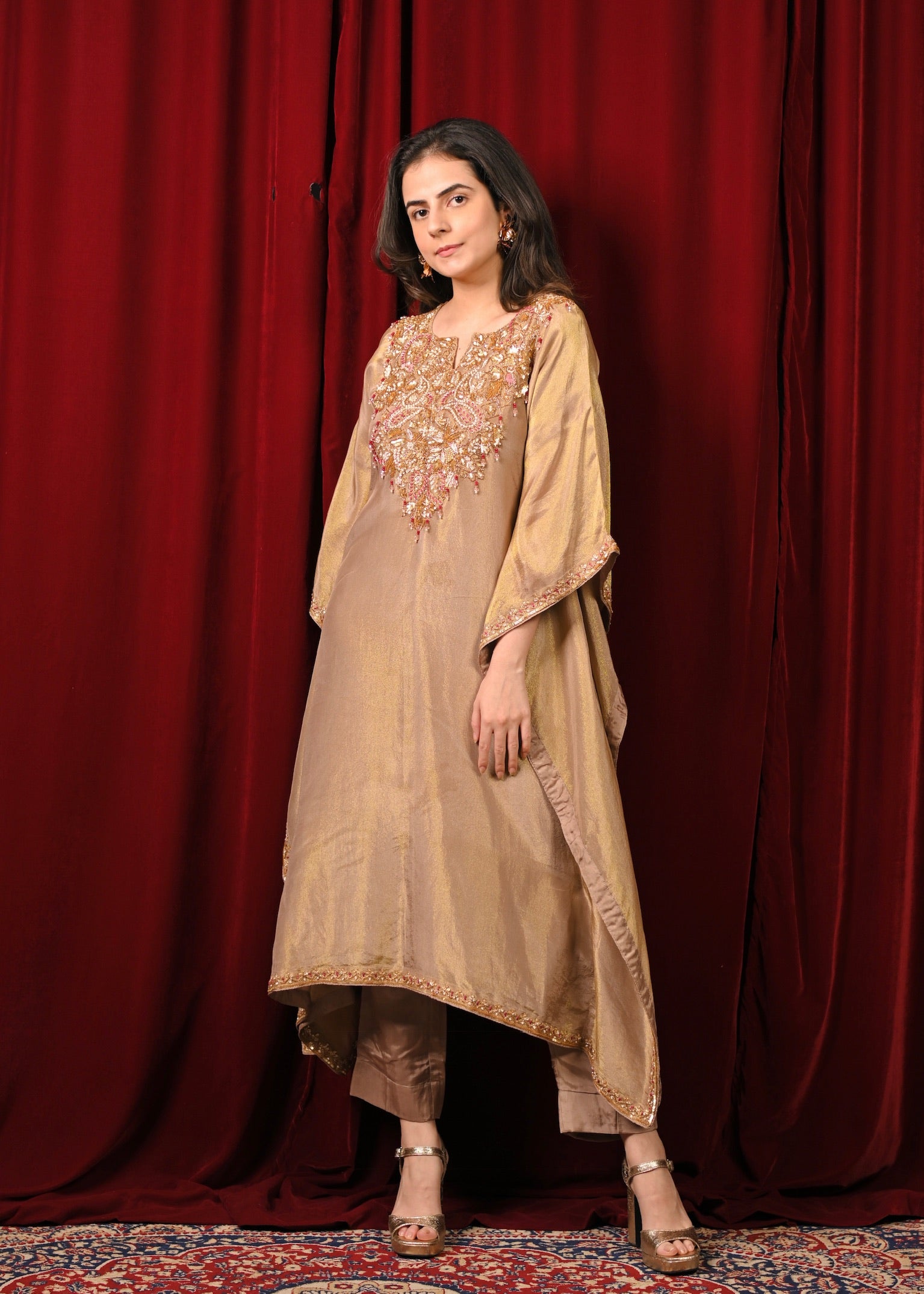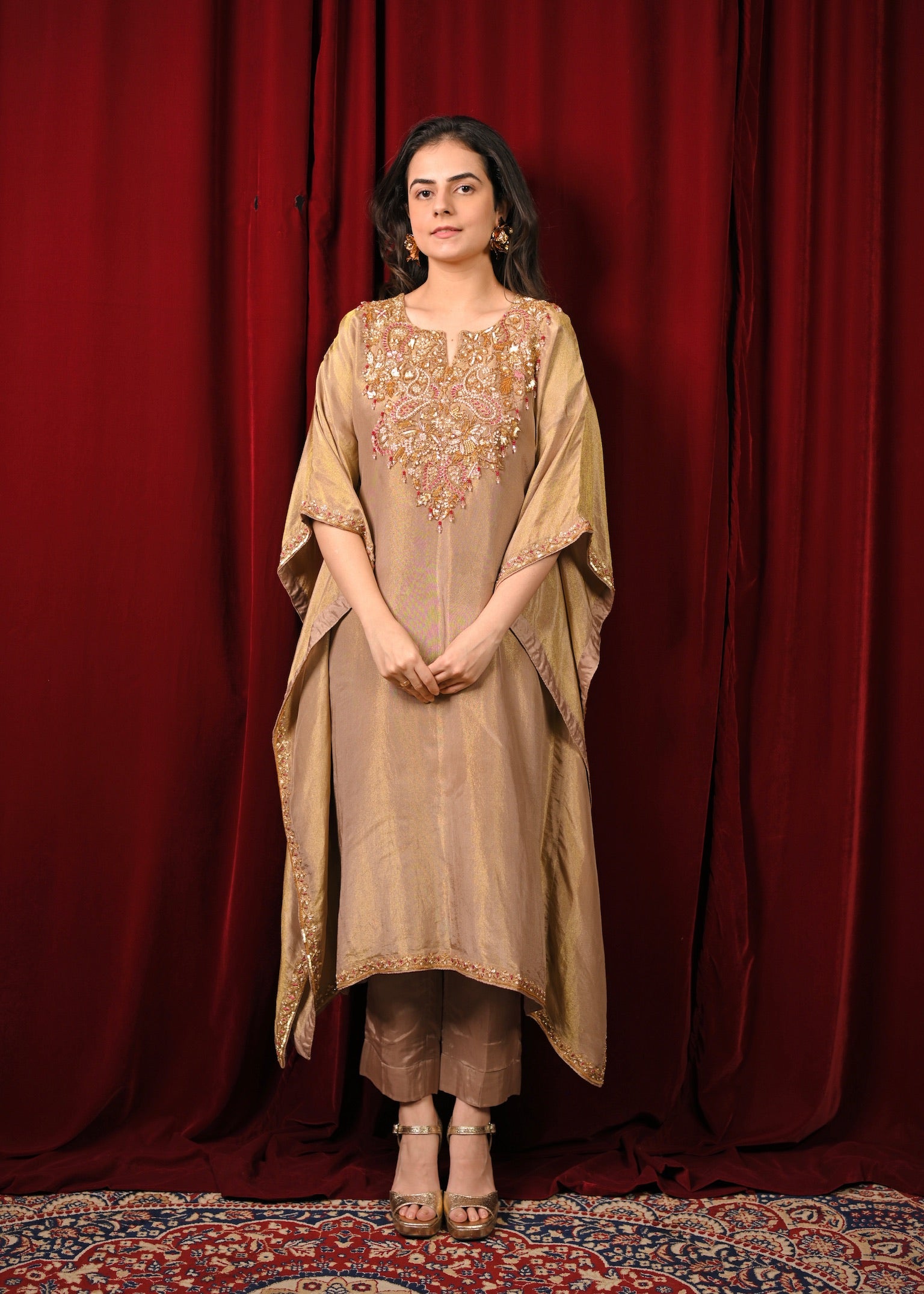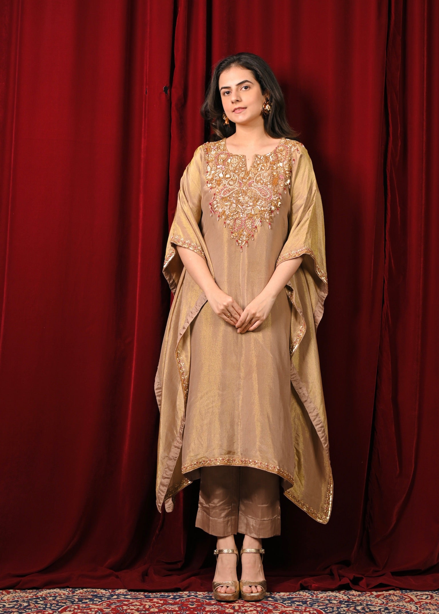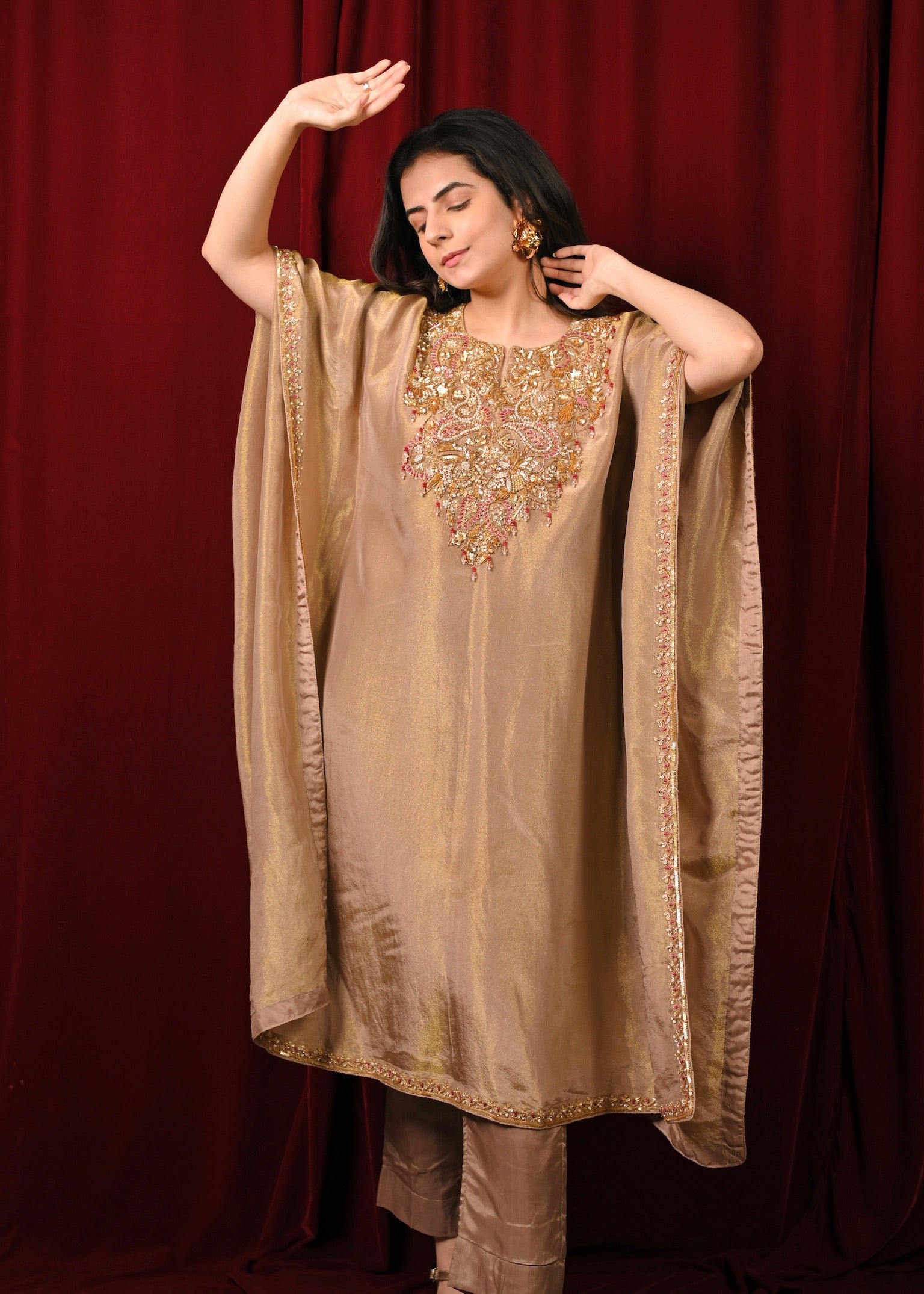 Elevate your festive elegance with this stunning champagne kaftaan, crafted in luxurious shimmer tissue fabric and paired with soft silk pants for a refined, effortless silhouette. The highlight of this ensemble is the exquisite hand embroidery on the neckline, intricately detailed with delicate beads and threadwork that add a touch of regal charm.