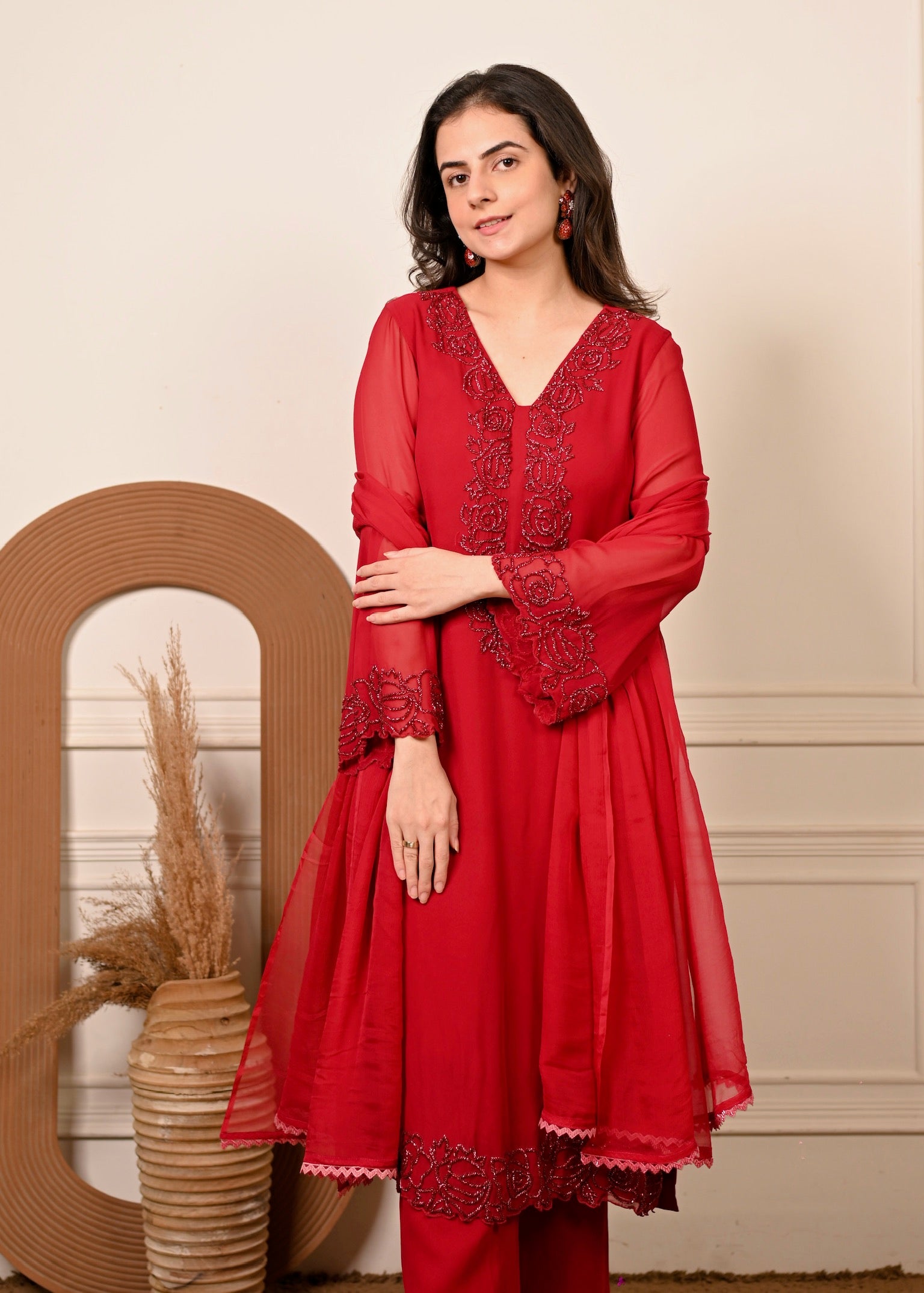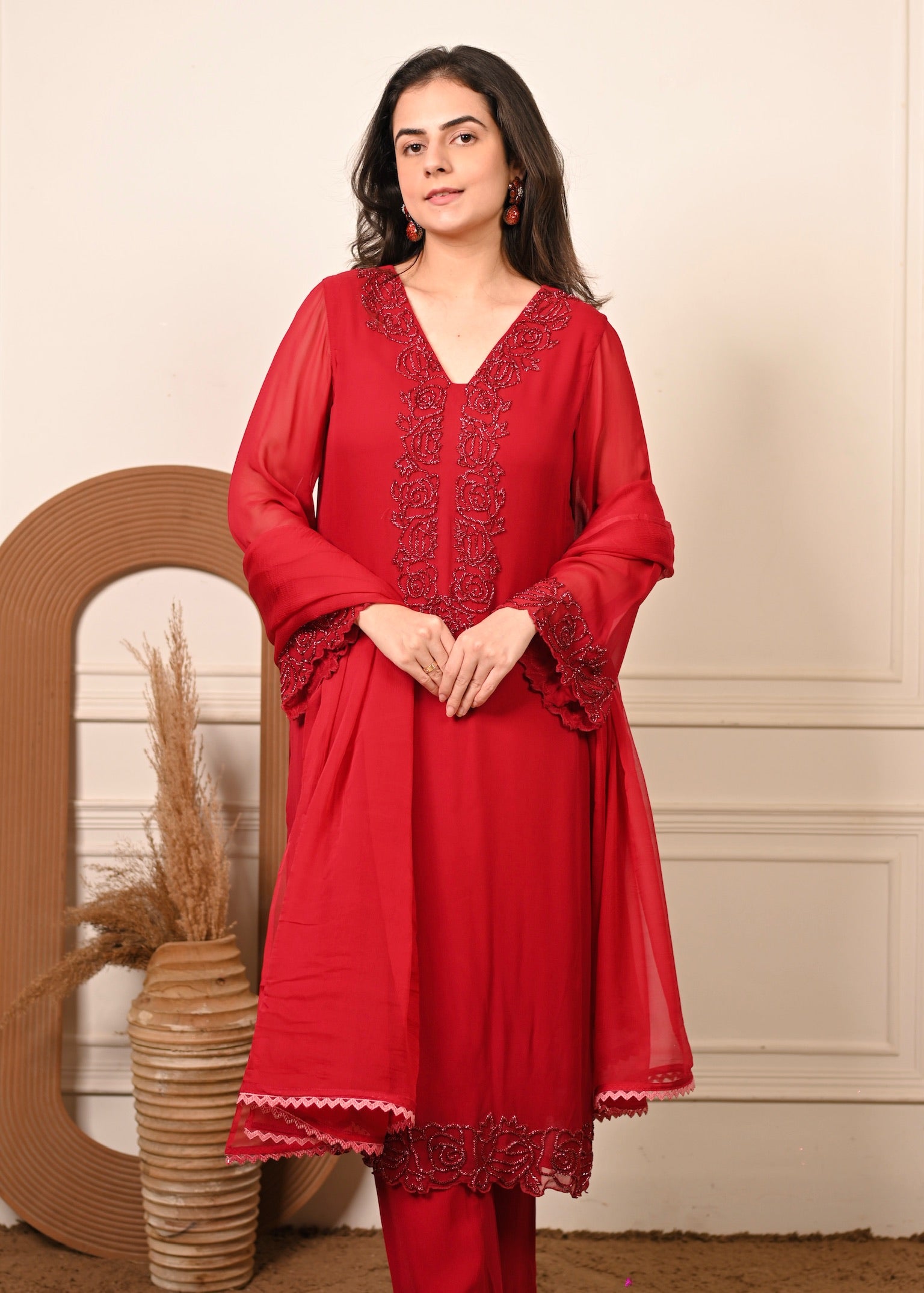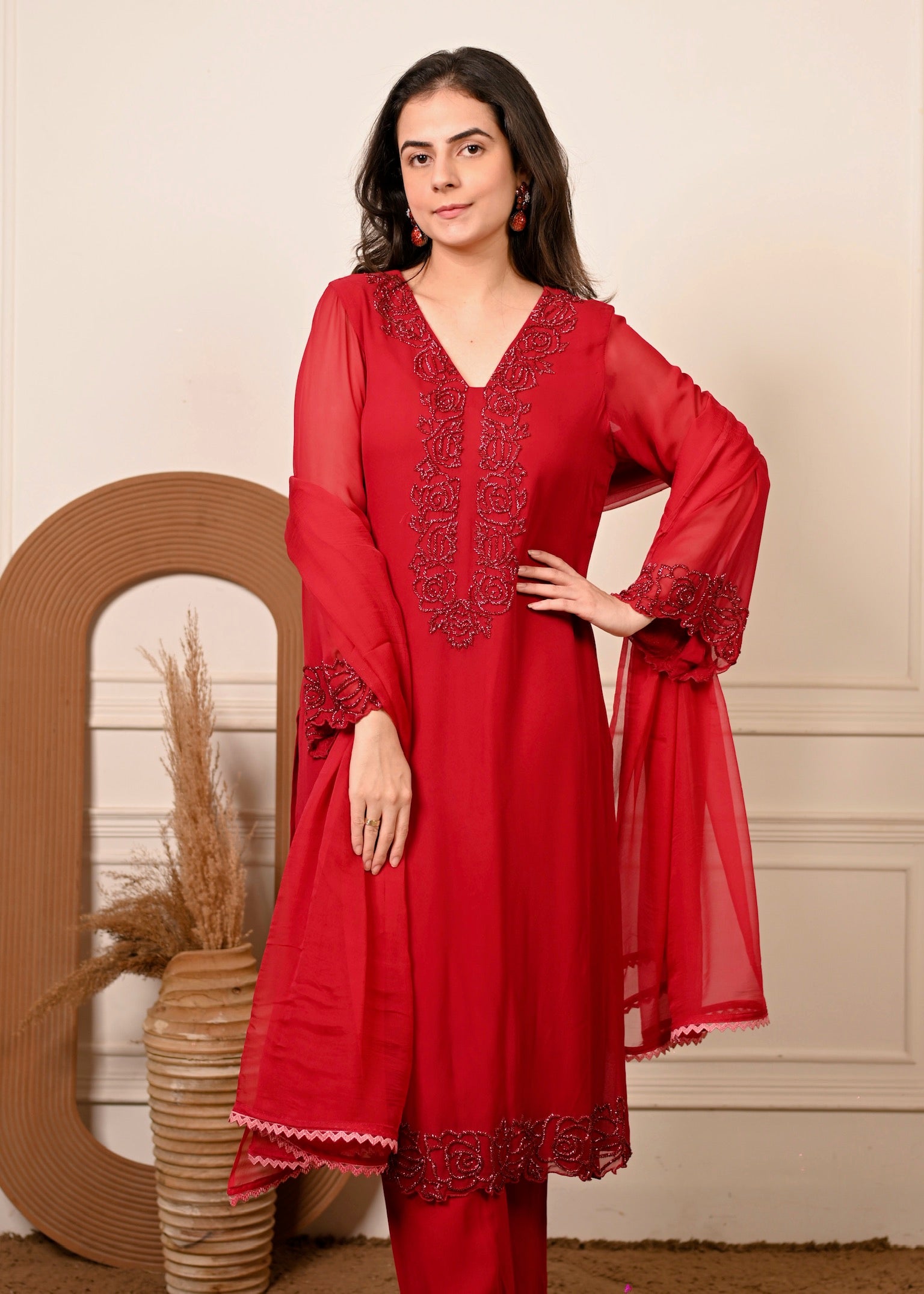 Radiate effortless grace in Sheesh Ruby — a timeless georgette ensemble in a rich ruby hue. The kurta features delicate hand embroidery that adds a touch of luxury to its fluid silhouette. Paired with a matching georgette dupatta, this set is perfect for festive evenings and elegant celebrations.