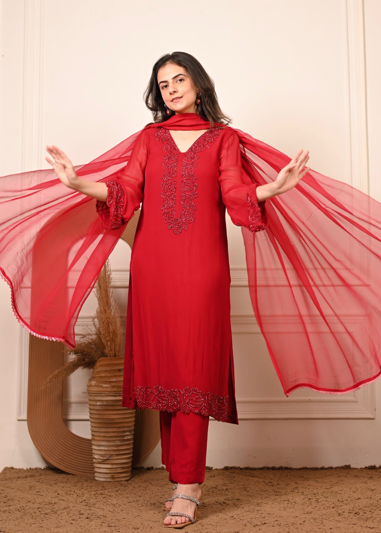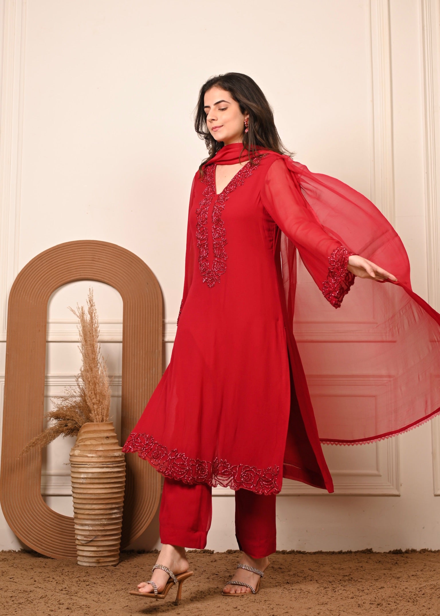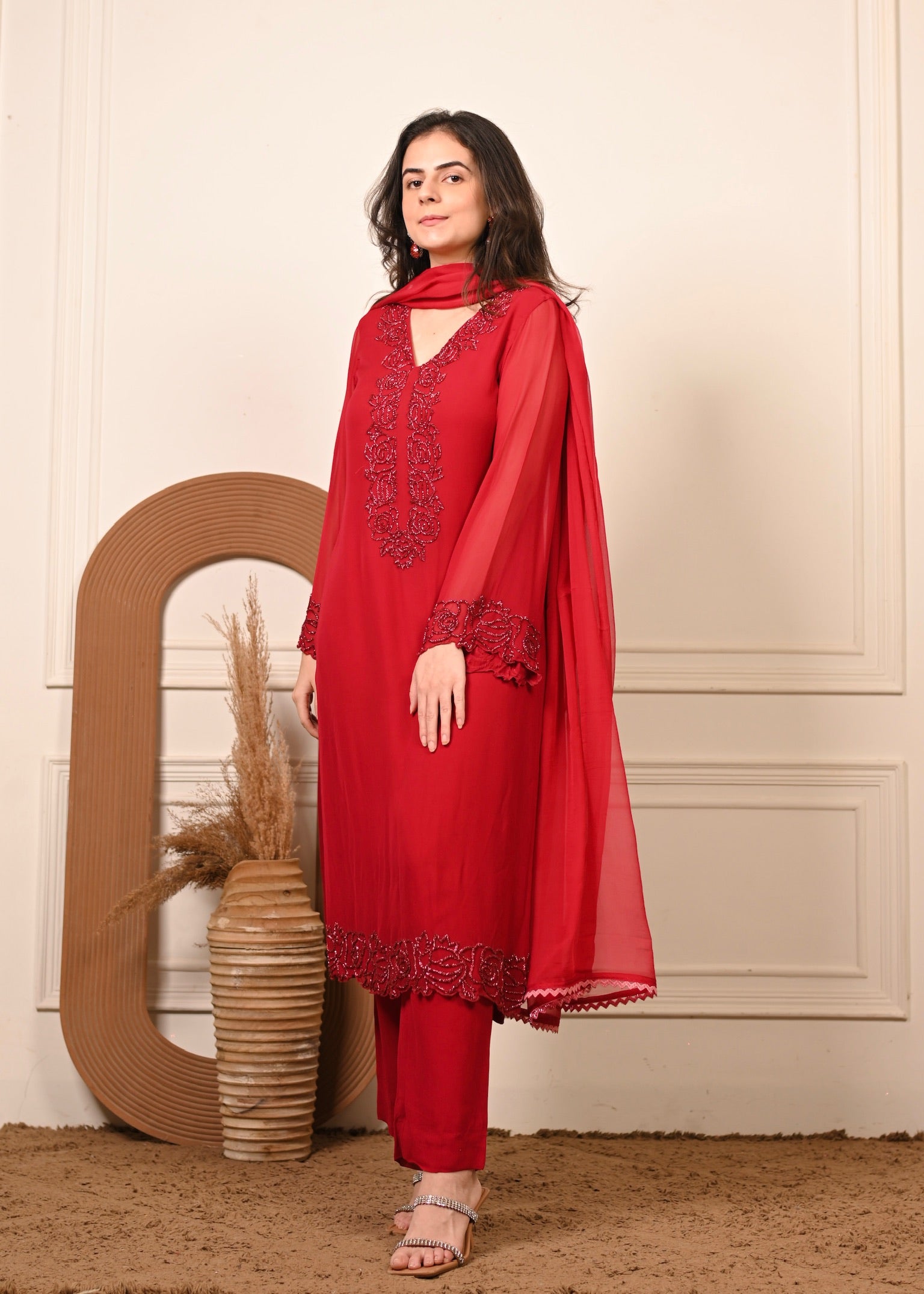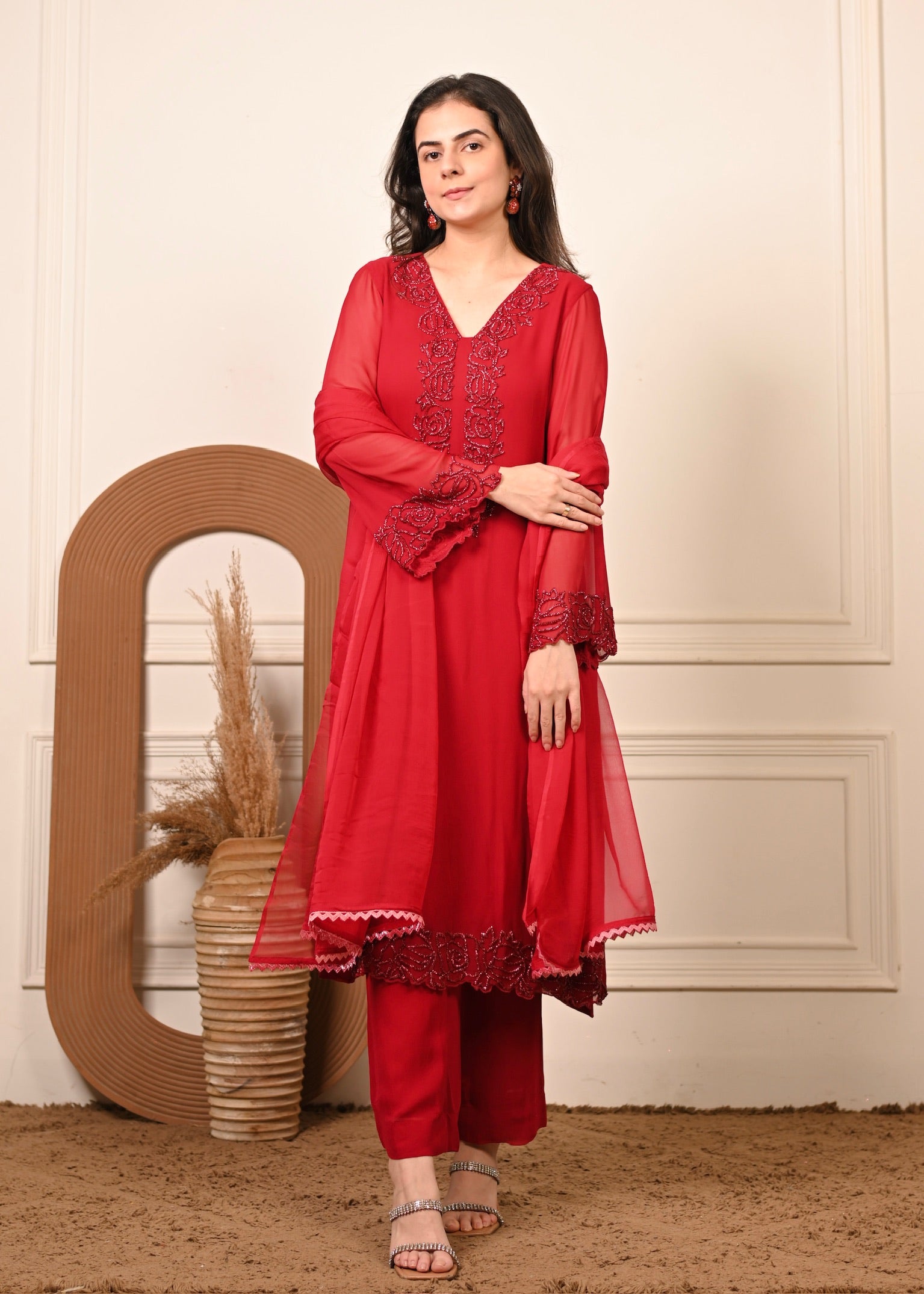 Radiate effortless grace in Sheesh Ruby — a timeless georgette ensemble in a rich ruby hue. The kurta features delicate hand embroidery that adds a touch of luxury to its fluid silhouette. Paired with a matching georgette dupatta, this set is perfect for festive evenings and elegant celebrations.
